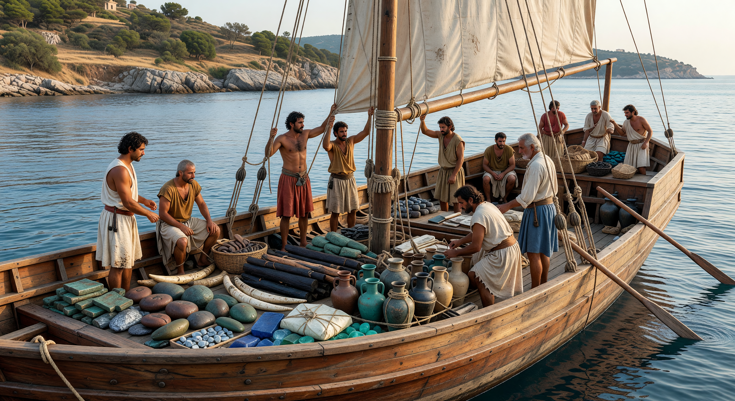 تُظهر هذه الصورة إعادة بناء حيّة لسفينة تجارية من طراز أولوبورون من أواخر العصر البرونزي، تمخر المياه الهادئة قبالة ساحل الأناضول الجنوبي الغربي وهي مثقلة بحمولتها من سبائك النحاس والقصدير، وخشب الأبنوس، وأنياب العاج، وسبائك الزجاج، والجرار الكنعانية المختومة، بينما ينشغل البحارة بضبط الشراع والحبال. يستند هذا المشهد إلى حطام أولوبورون الشهير قرب كاش في تركيا، والمؤرخ إلى القرن الرابع عشر قبل الميلاد، وهو من أهم الاكتشافات الأثرية البحرية لفهم التجارة الدولية في شرق البحر المتوسط. تكشف هذه السفينة كيف ربطت شبكات البحر في العصر البرونزي بين قبرص وبلاد الشام ومصر والأناضول والعالم الإيجي، حاملةً مواد خام فاخرة وأساسية عبر مسافات طويلة في عالم كان البحر فيه طريقاً رئيسياً للثروة والتواصل.