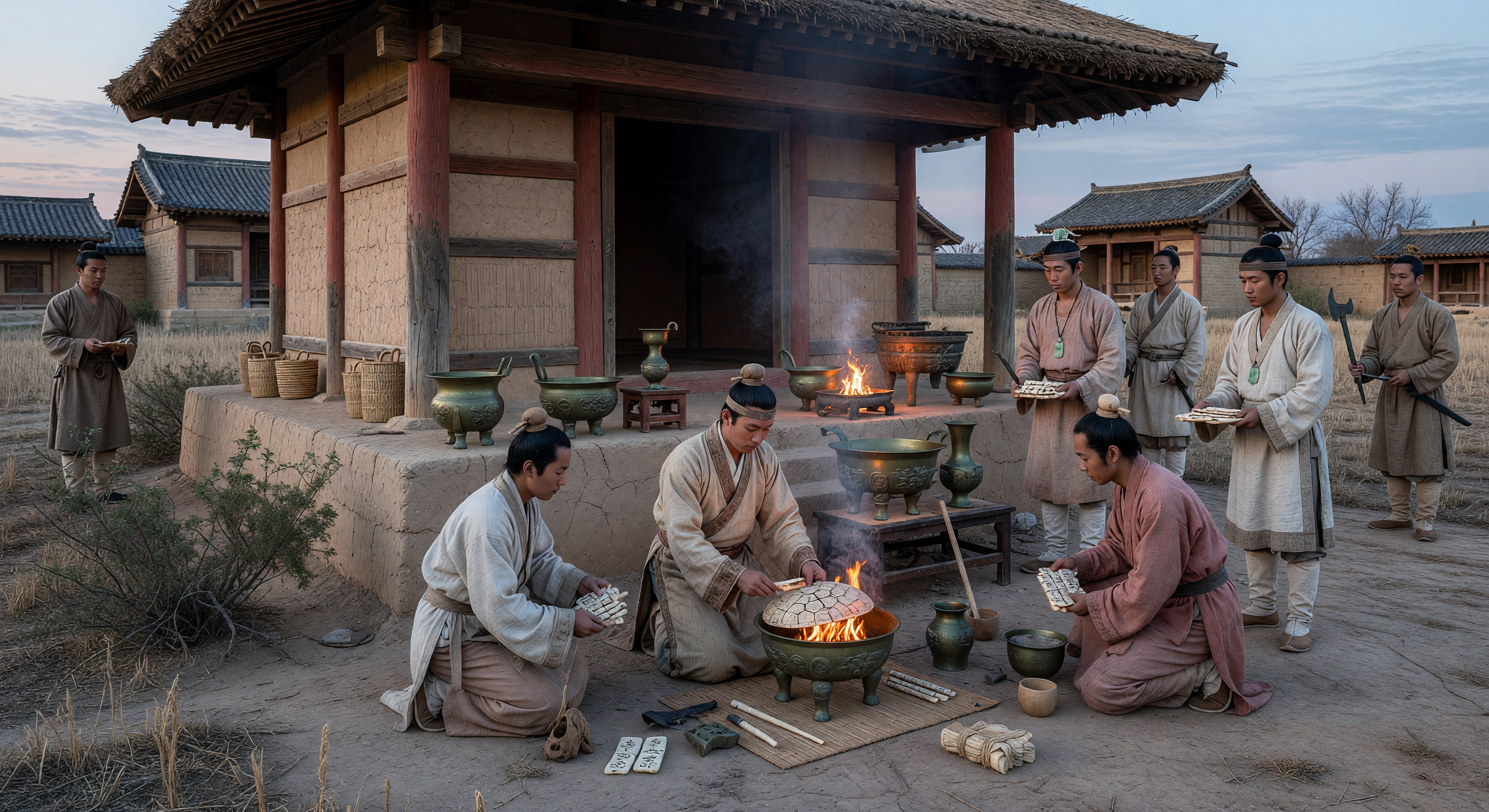 في ضوء نار الموقد البرونزي، يجثو عرّاف ملكي من أواخر عهد شانغ في يينشو قرب أنيانغ، وهو يسخّن لوح كتف ثور وصدفة سلحفاة مثقوبتين بعناية لتوليد التشققات التي تُقرأ منها إرادة الأسلاف والآلهة. خلفه ترتفع قاعة طقسية خشبية فوق مصطبة من التراب المدكوك، بينما يحيط به خدم بملابس من القنب والحرير يحملون عظام العرافة المنقوشة، وتلمع أواني البرونز الطقسية المزخرفة بأقنعة تاوتيه في وهج المساء البارد. تكشف هذه الطقوس، التي اشتهرت بها أسرة شانغ بين القرنين الثالث عشر والحادي عشر قبل الميلاد، عن عالم حكمٍ ارتبطت فيه السلطة الملكية بالكتابة المبكرة وصبّ البرونز الفاخر والتواصل مع قوى ما فوق البشر.