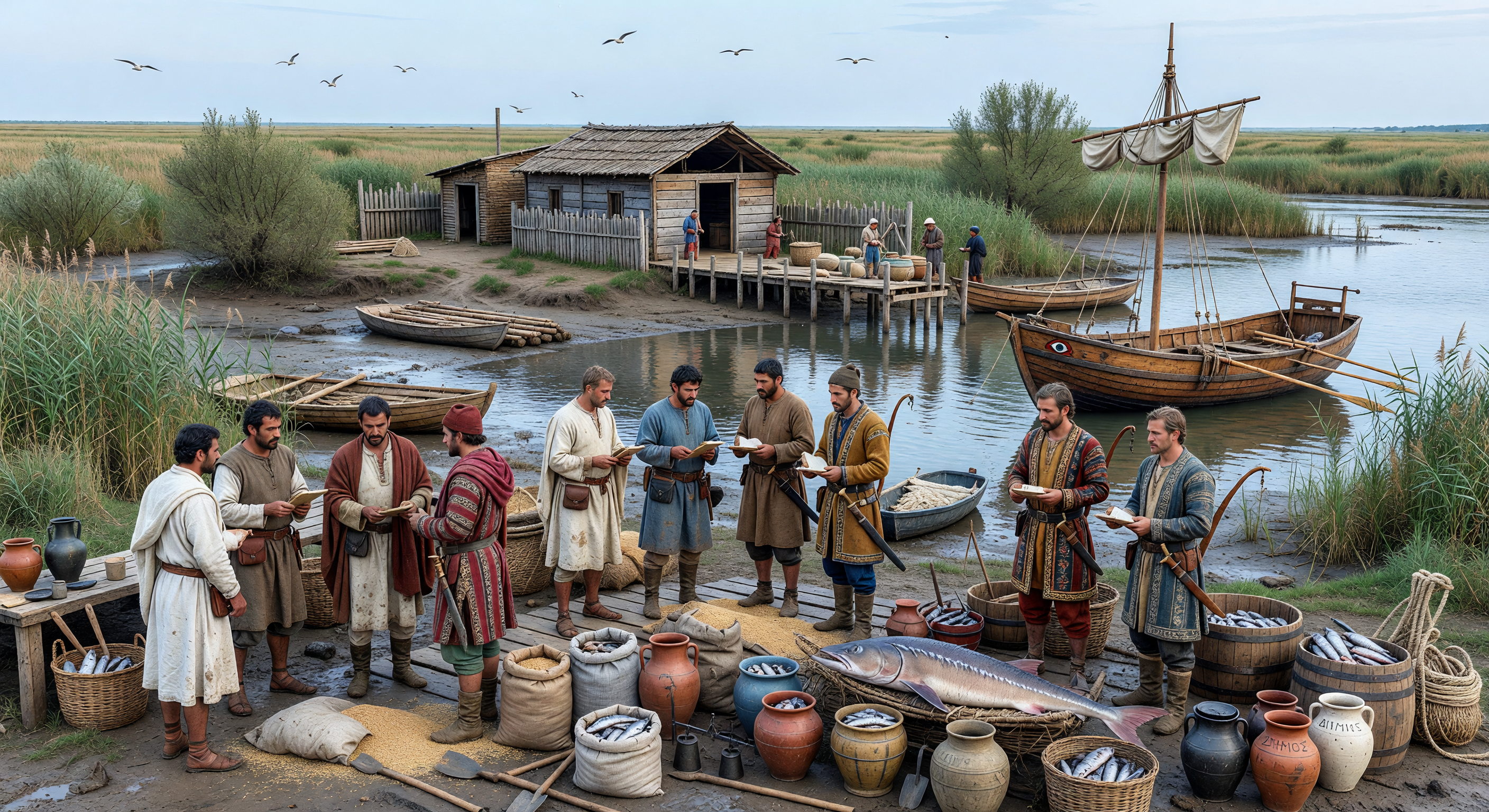 The image captures a plausible Iron Age Black Sea estuary setting with muddy banks, reed beds (Phragmites australis, accurate for the region), wooden sheds on stilts, and simple dugout-style river craft, evoking a frontier harbor effectively. Trade goods like amphorae (terracotta jars for fish/salted goods), grain sacks, baskets, ropes, and a large sturgeon (Beluga or similar, native to Black Sea) are spot-on for the period and zone. The landscape with gulls and overcast skies fits the northern Black Sea's brackish, marshy estuaries. However, clothing shows minor issues: figures wear long belted tunics or robes with cloaks/boots that lean generically archaic but lack sharp Greek-Scythian distinction—Greeks should have chiton/himation (shorter, draped wool) while Scythians need patterned kaftan trousers, pointed bashlyk caps, and steppe accessories (gorytos quiver, akinakes dagger, torques); current dress is too uniform and 'Viking-esque' in boots/wool layers. The single sailboat with a lateen-ish sail and clinker hull resembles medieval Nordic vessels more than 6th-century BC Greek penteconters or river scowls (oar-driven, no late sails). No barrels visible (good, addressing colleague note), but cultural specificity and boat tech need refinement for full accuracy—visual coherence is strong, no major anachronisms beyond that.