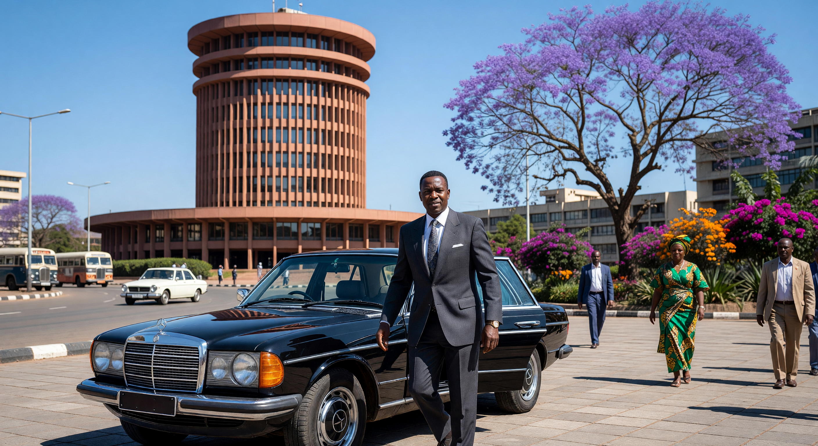 يصور هذا المشهد من نيروبي عام ١٩٧٨ رجل أعمال كيني يترجل من سيارة مرسيدس-بنز سوداء، وهي الرمز الشهير لنخبة "الوابينزي"، أمام مركز كينياتا الدولي للمؤتمرات بتصميمه الأسطواني المهيب. يعكس المبنى طراز "الحداثة الاستوائية" من خلال خطوطه الهندسية الخرسانية التي تلاعب الضوء والظل، مجسداً طموح وتفاؤل الأمة في مرحلة ما بعد الاستقلال. يبرز التباين بين أناقة البدلة الرسمية وأزهار الجاكارندا الأرجوانية النابضة بالحياة جوهر العاصمة الكينية في أوج ازدهارها، موثقاً حقبة تميزت بالتحول الحضري السريع والهوية الأفريقية المعاصرة.