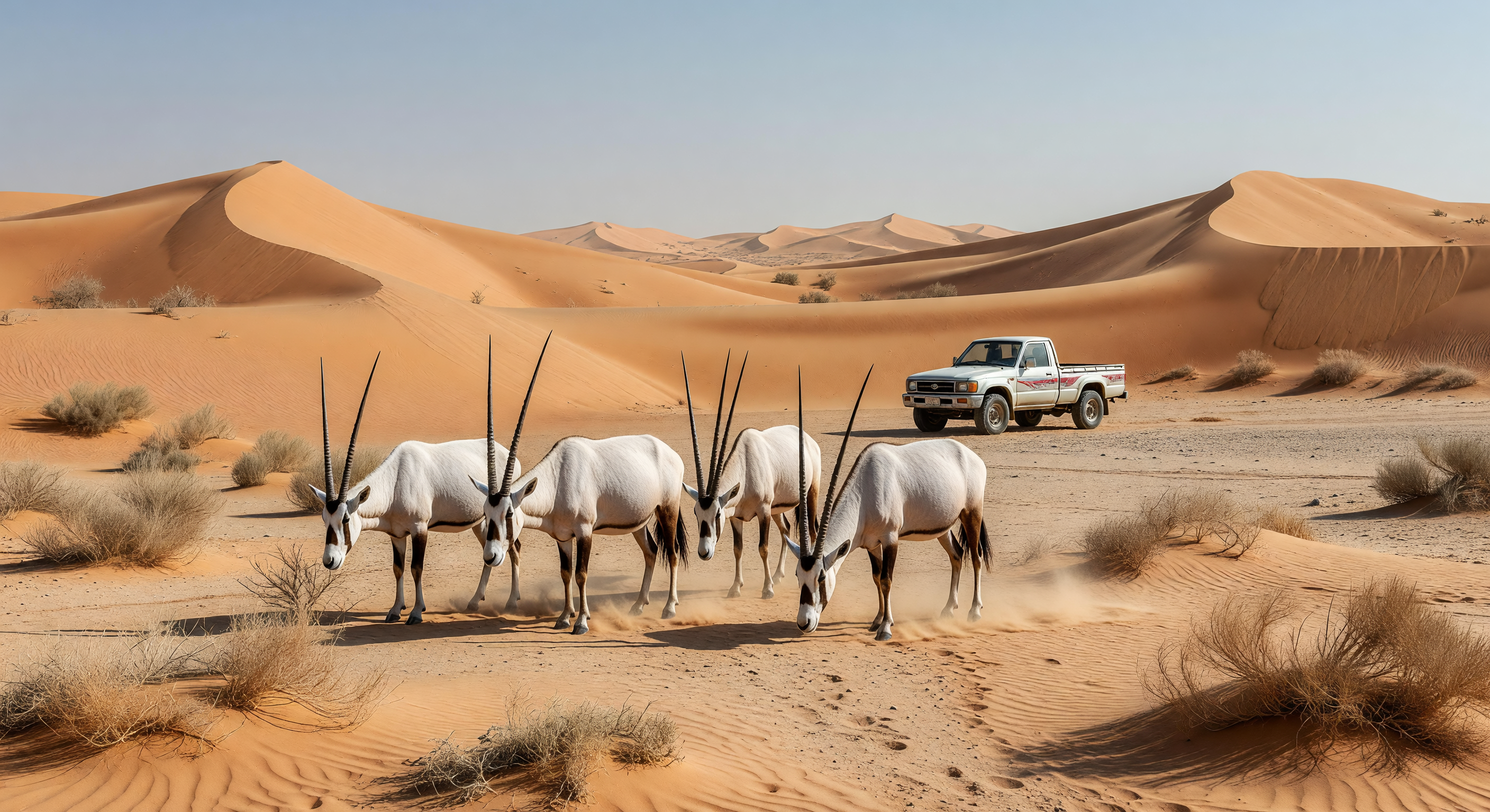 - 한국어: 룹알할리 사막의 아라비아 오릭스와 토요타 하이럭스