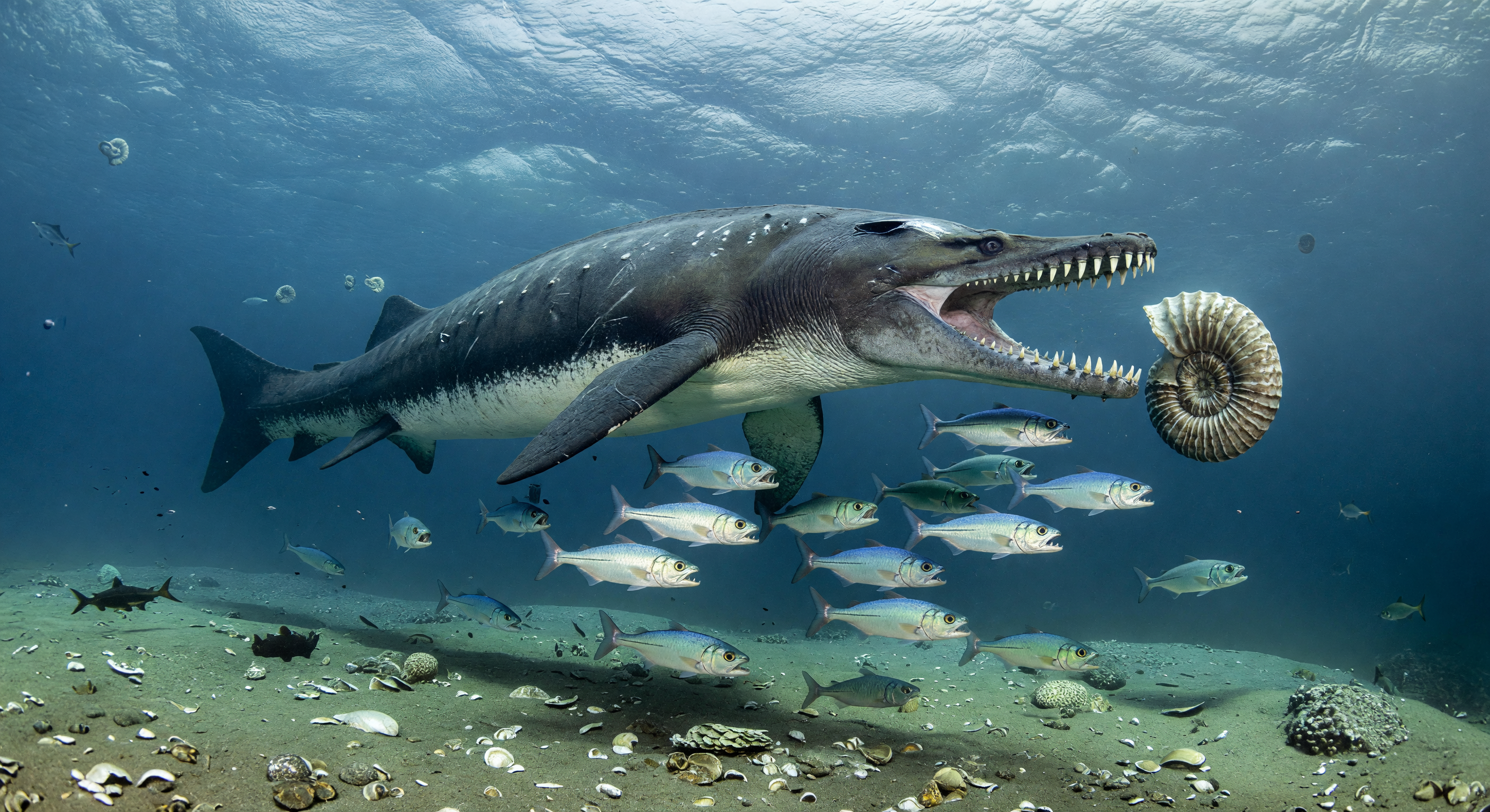 The committee agrees that the scene is broadly set in a plausible Late Cretaceous marine environment: a large mosasaur-like predator is shown underwater with a school of teleost fish, a shelly seafloor, and a heteromorph ammonite/cephalopod present. The overall Cretaceous, southern marine setting is credible at a high level, and the caption’s Late Cretaceous Chilean context is broadly consistent with known Maastrichtian marine faunas.