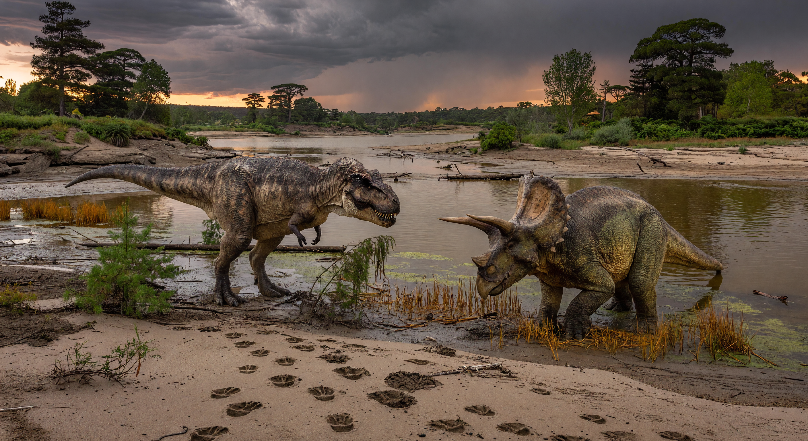 عند الغسق في أواخر العصر الطباشيري، قبل نحو 67–66 مليون سنة، يقف تريسيراتوبس هوريدوس الضخم موقفًا دفاعيًا على ضفة رملية قرب بحيرة هلالية آخذة في الانكماش، بينما يقترب منه بحذر مفترس تيرانوصور ركس بطول يقارب 12 مترًا، بجسم مكسو أساسًا بحراشف حصوية مع خيوط ريشية متناثرة قليلة. تُظهر هذه اللحظة المتوترة من سهول لارا ميديا الفيضية في غرب أمريكا الشمالية—ضمن نظام هيل كريك البيئي—صدامًا محتملًا بين اثنين من أشهر ديناصورات نهاية الدهر الوسيط، وسط قصب مسحوق وآثار أقدام غائرة ووحل حملته عاصفة وشيكة. إنها لمحة أخيرة من عالم مزدهر سبق مباشرةً الانقراض الجماعي الذي أنهى عصر الديناصورات غير الطيرية.