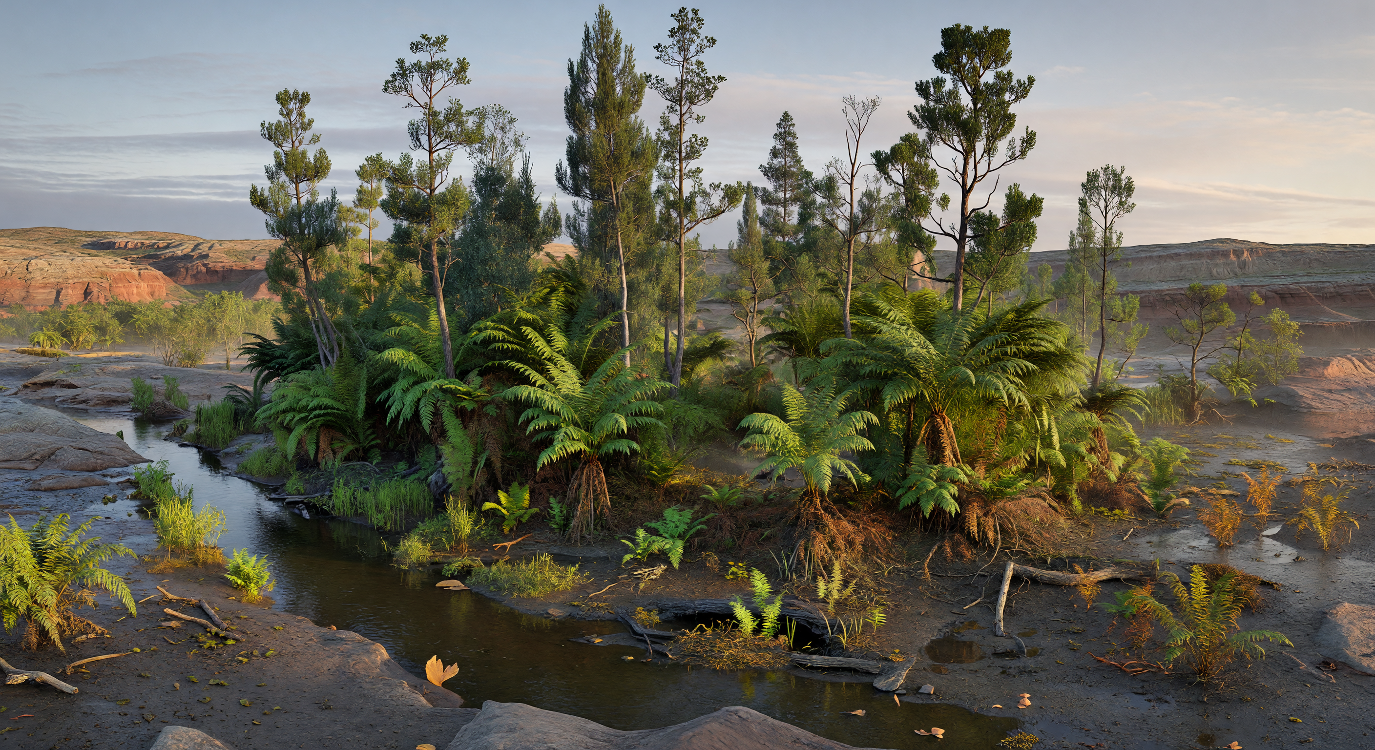 في هذه الغابة القطبية من أواخر العصر الثلاثي، قبل نحو 220–205 ملايين سنة، كانت منطقة عبر القارة القطبية الجنوبية جزءًا معتدلًا ورطبًا من غوندوانا، لا تغطيه الثلوج رغم وقوعه عند خطوط عرض جنوبية عالية. يهيمن على المشهد غطاء كثيف من سرخسيات البذور ديكرويديم Dicroidium ذات الوريقات المتشعبة، تتخلله مخروطيات مبكرة طويلة ونباتات سرخسية وذنب الخيل على أرضٍ طينية مشبعة بالماء قرب مجرى نهري داكن وبطيء. تكشف هذه البيئة، المحفوظة في طبقات الحجر الرملي والطيني الأحمر، عن عالم دفيء موسمي ازدهرت فيه نباتات غوندوانا المميزة قبل أن تبدأ النظم البيئية الحديثة بالتشكل.