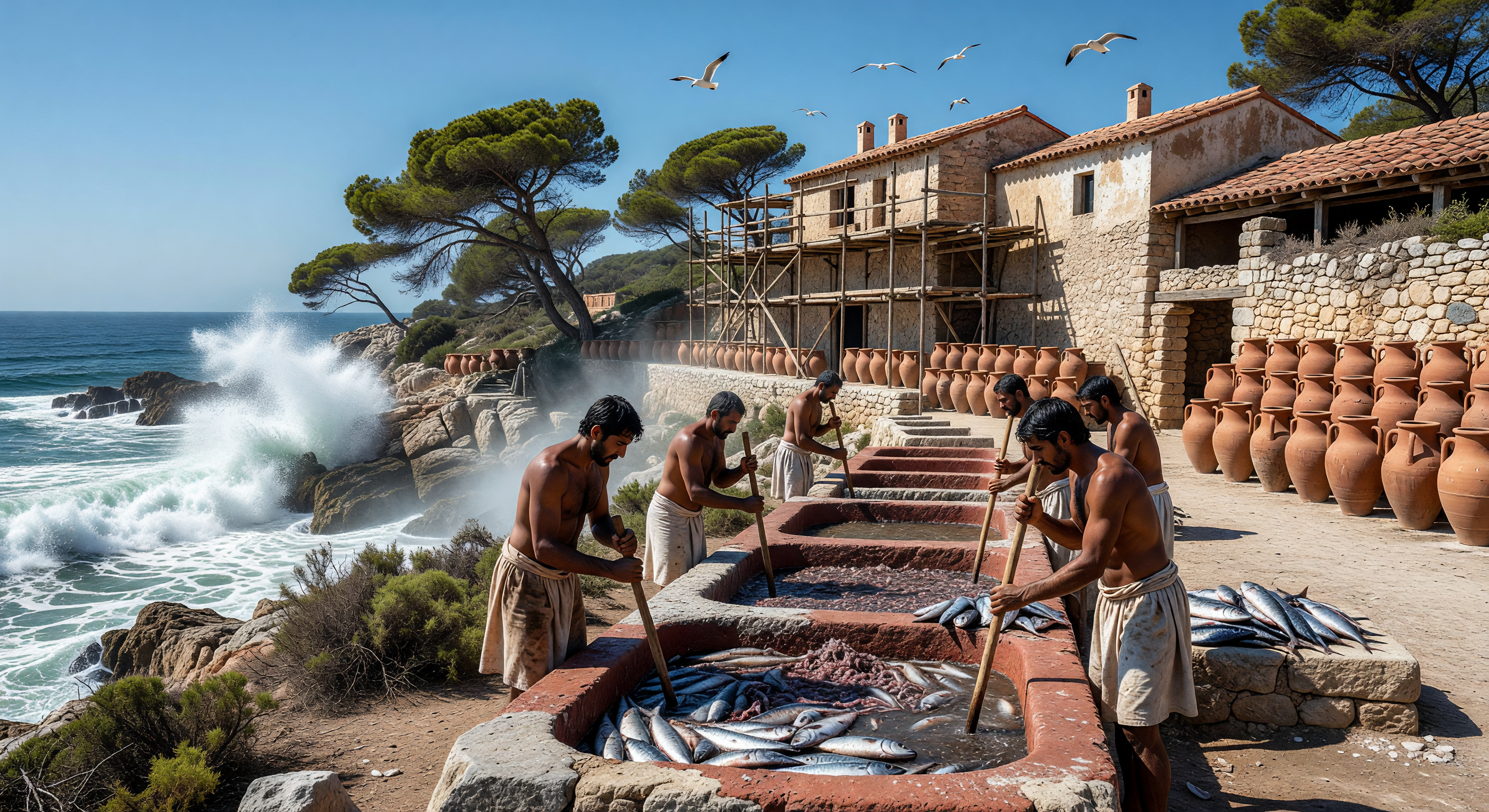 The image excels in historical and cultural accuracy for a Roman garum production site like Baelo Claudia in southern Hispania. Key elements are spot-on: laborers in short tunics (subligaria and basic tunics plausible for manual workers), red opus signinum-lined vats (the reddish rectangular basins match archaeological descriptions of waterproofed concrete vats), rows of terracotta amphorae for storage/export, stone architecture with tiled roofs, Mediterranean stone pines, seagulls, and a rocky Atlantic coastal landscape. The mackerel-like fish (small, silvery) and stirring process visually align with garum fermentation stages. No major anachronisms; minor scaffolding is plausible for construction/repairs in a working factory, and the surf, while dramatic, reflects the stormy Atlantic exposure of the region without flooding the site implausibly. Visual coherence is strong, with scientific plausibility in biology (fish species local to Iberian coasts) and geology (limestone cliffs). This merits approval as highly appropriate for the period/region.