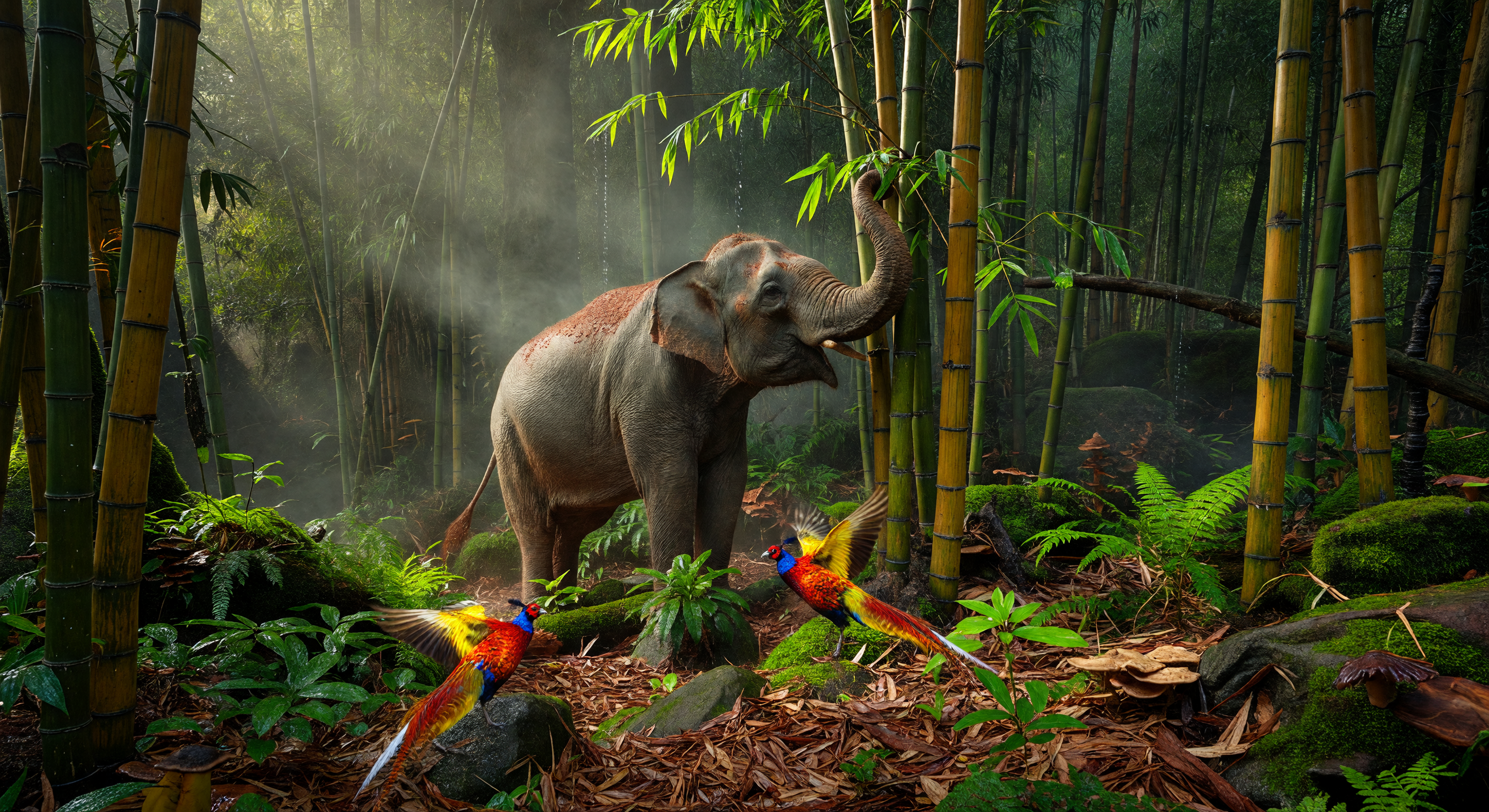 The committee agrees the scene broadly evokes a plausible subtropical East Asian forest: dense bamboo, humid haze, leaf litter, ferns, and an Asian elephant are all compatible with a southern China/Late Antiquity setting in a general ecological sense. The Golden Pheasant is also a species with a real historical East Asian range, so the overall biological concept is not implausible.