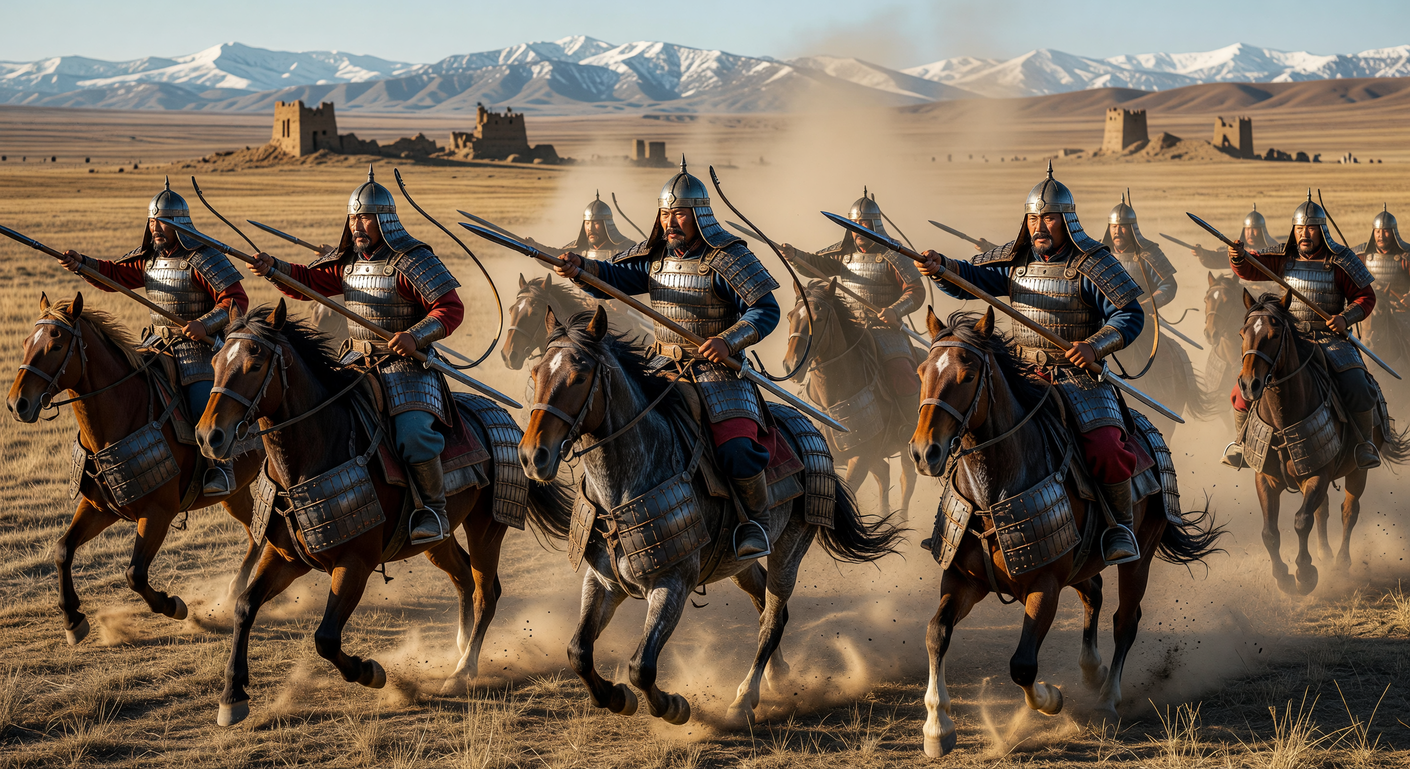 The image depicts a tight formation of heavily armored cavalry charging across a dusty steppe with snow-capped mountains and distant mud-brick towers in the background, evoking a dramatic battle scene. While the overall steppe landscape is plausible for the Mongolian-Manchurian region, and elements like lamellar armor on warriors and horses align broadly with late antique East Asian nomadic cavalry, significant anachronisms undermine accuracy. Helmets resemble 13th-century Mongol designs (pointed, fur-trimmed with cheek guards) rather than 4th-century Xianbei styles, which were simpler and influenced by Han or proto-Turkic forms per archaeological finds like those from Northern Wei tombs. Horse barding is excessively elaborate and uniform, more akin to Sassanid or medieval European cataphracts than the variable, lighter scale/lamellar protections of Xianbei heavy horse. Background architecture (conical mud-brick towers) suggests Central Asian Silk Road forts, not typical 4th-century Mongolian-Manchurian steppe structures, which were yurts or rudimentary earthworks. Stirrups appear present but stylized in a later, dangling European manner rather than the paired-toe-loop or early rigid forms evidenced in North Asian contexts around 300-400 CE. The rigid 'phalanx'-like formation is visually coherent but implausible for fluid nomadic cavalry tactics. These issues require a full regenerate for period-specific redesign.