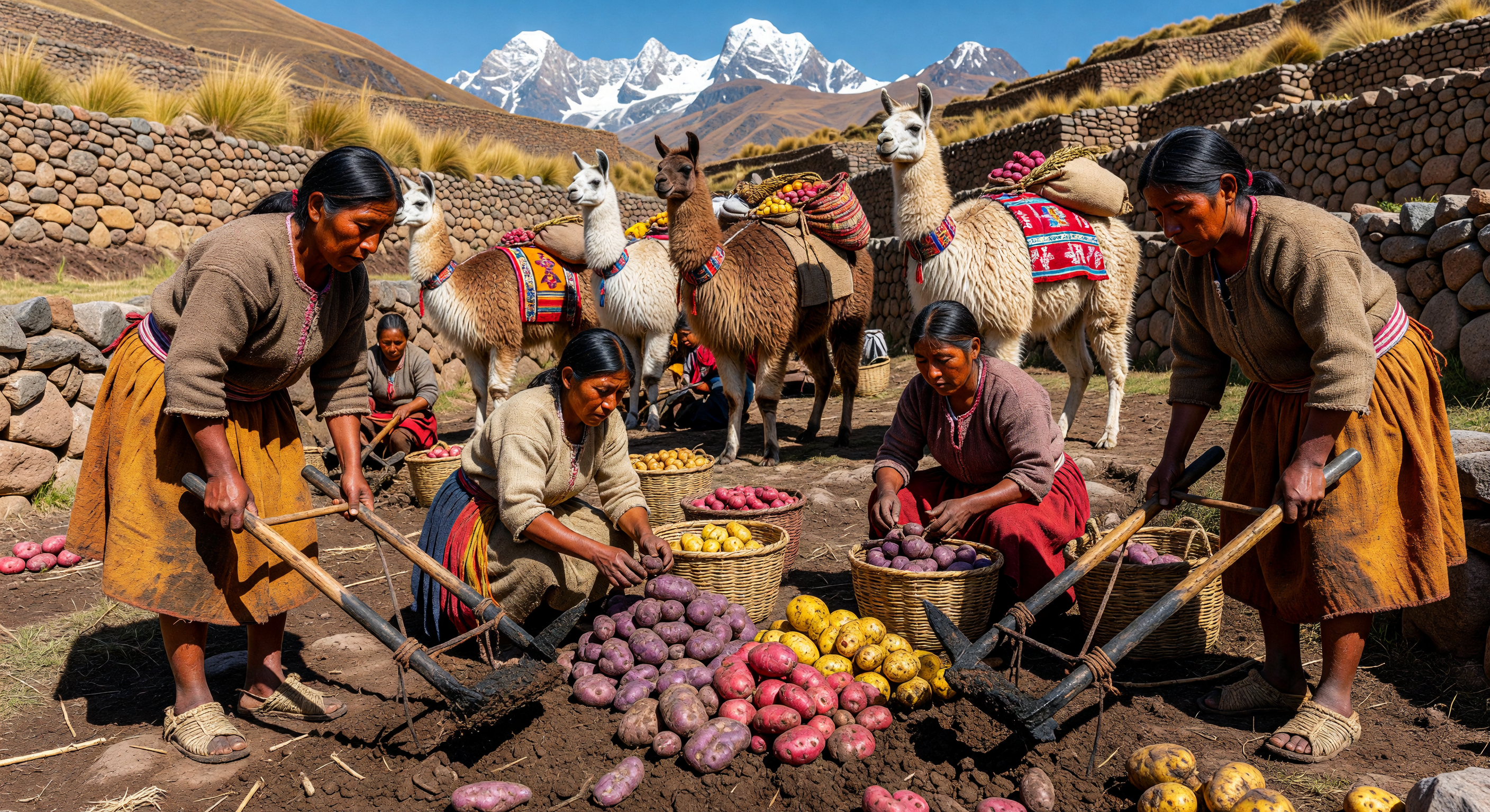 - Español: Agricultores andinos cosechando papas en terrazas del siglo IV
