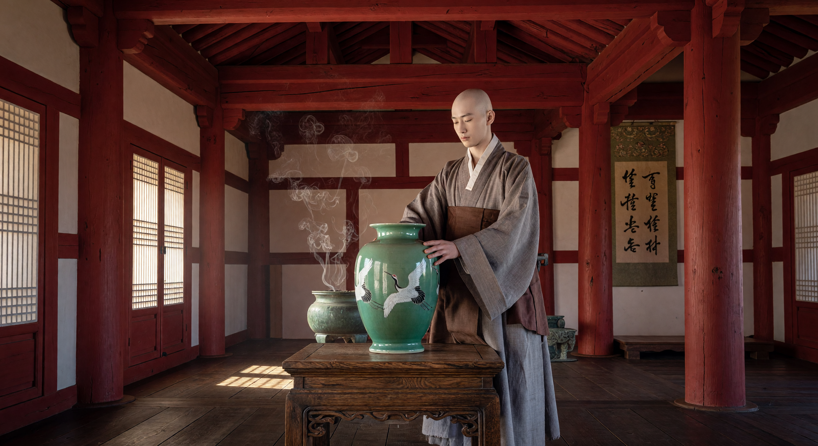 يُصور هذا المشهد راهباً من مملكة غوريو في القرن الثاني عشر وهو يضع بعناية مزهرية "سيلادون" خضراء مزينة بنقوش طيور الكركي على مذبح منحوت داخل معبد بوذي يتميز بأعمدته الحمراء ونظام التدفئة الأرضي "أوندول". يعكس الضوء الطبيعي المتسلل عبر ورق الـ"هانجي" التباين الجمالي بين نعومة الخزف المصقول وخشونة الأردية الرهبانية، مما يبرز ذروة الرقي الثقافي والحرفي لتلك الحقبة. تجسد هذه اللوحة السكينة الروحية والبراعة المعمارية التي ميزت العصر الذهبي لكوريا في العصور الوسطى.