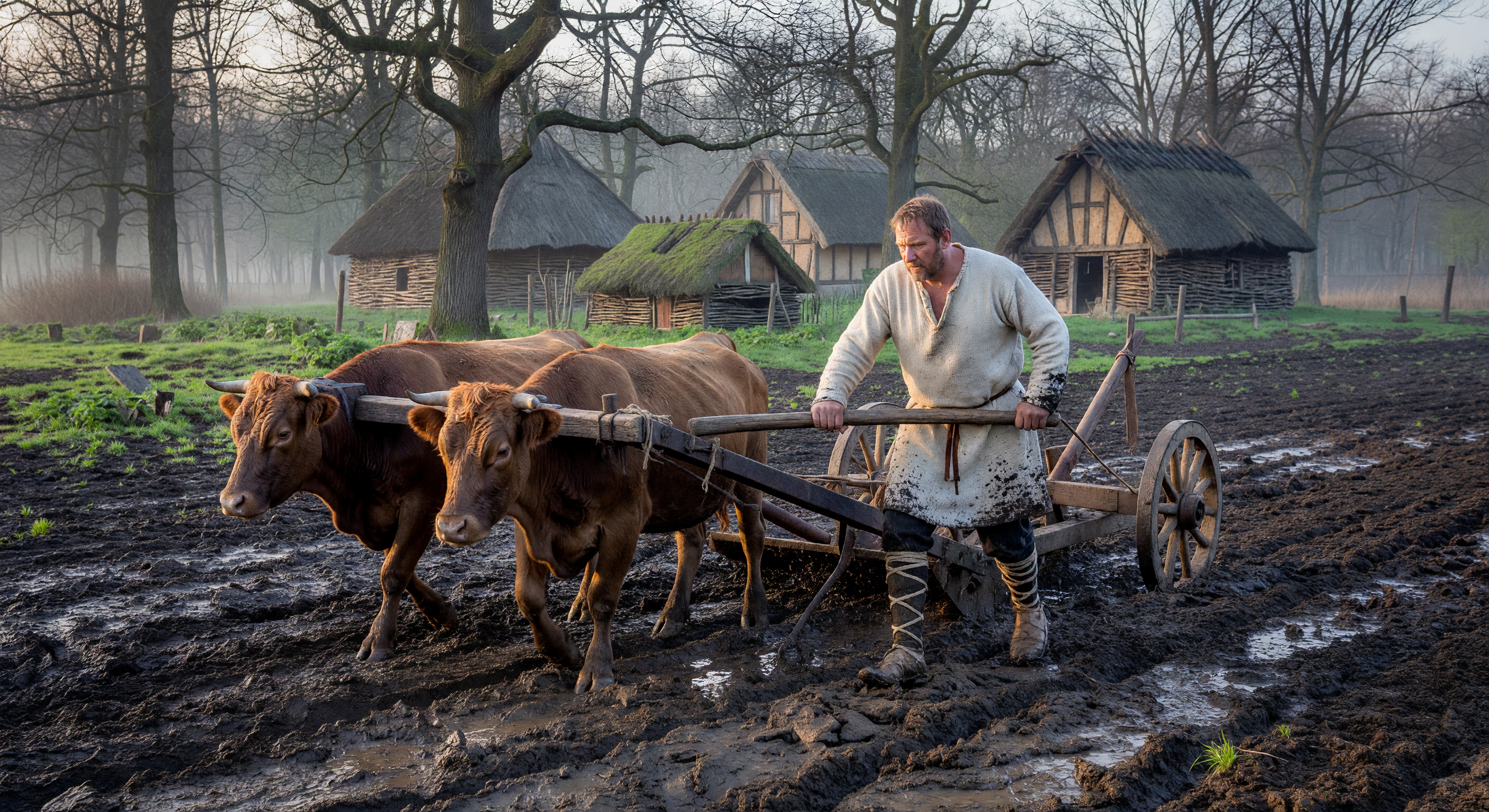 يصور هذا المشهد فلاحاً فرانكياً في القرن الثامن وهو يكدح في حراثة تربة "أوستراسيا" الطينية الثقيلة، مستخدماً محراث "كاروكا" المتطور الذي يجره زوج من الثيران القوية تحت ضوء فجر ربيعي بارد. يظهر المحراث بشفرته الحديدية وعجلاته الخشبية وهو يقلب الأخاديد الرطبة بفعالية، بينما تلوح في الأفق ملامح قرية تقليدية ببيوتها المصنوعة من الغصون والطين وسط ضباب الغابة الكثيف. يعكس هذا العمل الشاق الابتكار التقني في العصور الوسطى المبكرة، حيث مكنت هذه الأدوات الزراعية الجديدة المجتمعات من استغلال الأراضي الصعبة وتأمين الغذاء اللازم لنمو الحضارة الأوروبية الناشئة.