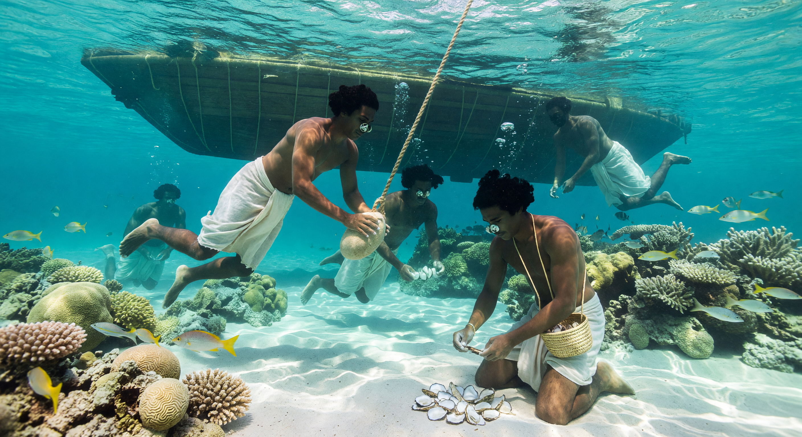 The image successfully captures the core activity of pearl diving with several historically plausible elements: the sewn-plank vessel visible from below is a reasonable representation of an early medieval Gulf dhow construction, the divers are bare-chested with simple white loin wraps consistent with period practice, rope descending lines are accurate, and the basket carried by one diver for collecting oysters is a documented historical tool. The oyster shells scattered on the seabed are a nice realistic touch. However, the nose clips visible on the divers appear as small round modern-looking plastic items rather than the horn or tortoise-shell clips described in the caption and documented in historical records — this is the most visually jarring anachronism. The marine ecosystem is the other significant issue: the coral reef shown is lush, vibrant, and dense in a way more reminiscent of the Maldives or the Great Barrier Reef than the Persian Gulf, which has shallower, murkier, sandier conditions with less dramatic coral formations. The fish species visible (yellowtail snappers, various reef fish) also appear more Indo-Pacific tropical reef than Gulf-specific. The gloves visible on some divers' hands are a notable anachronism — historical Gulf divers did not use rubber or latex gloves.