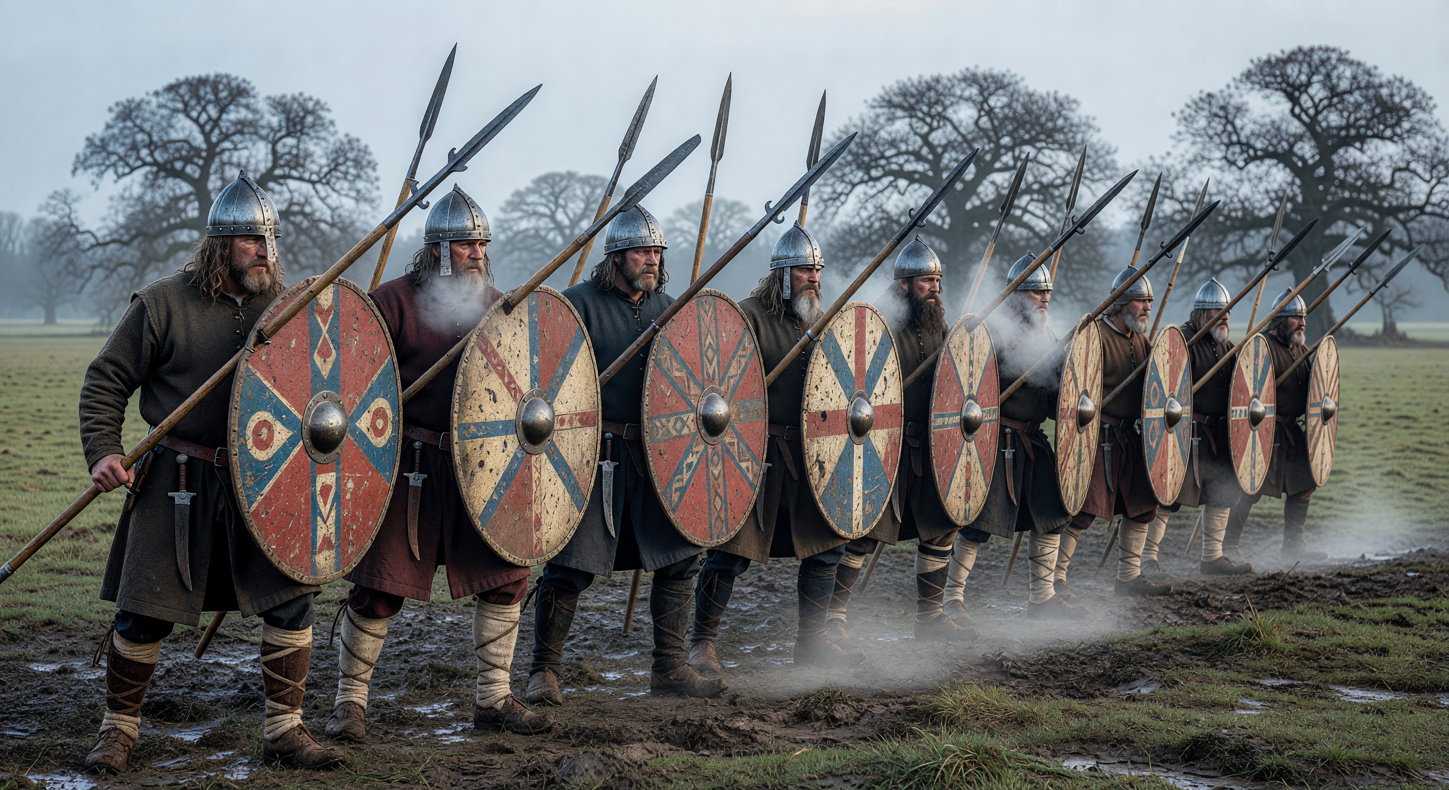 The image depicts a line of bearded warriors in long wool tunics, leg wrappings, and fur-trimmed cloaks, holding round lime-wood shields with vibrant red, blue, and geometric knotwork patterns, advancing across a misty, muddy meadow with bare oaks in a temperate European landscape. This visual strongly evokes Viking or late Anglo-Saxon warriors (8th-11th centuries), with nasal helmets, long beards, and shield designs featuring interlaced motifs typical of Scandinavian or Norse art styles, rather than the simpler geometric or plain Carolingian Frankish shields attested in archaeology (e.g., Childeric's tomb or Birka finds). The spears lack any 'winged' projections, appearing as plain ash shafts with leaf-shaped iron heads, and the formation is a loose advancing line rather than a locked shield wall. The Rhine Valley setting is plausible geologically (temperate floodplain meadow), but the overall aesthetic is anachronistic and culturally mismatched for 9th-century Franks, who favored more Roman-influenced tunics, fewer beards in depictions, and less ornate shields. No major issues with flora/fauna or coherence, but significant cultural anachronism requires full regeneration.