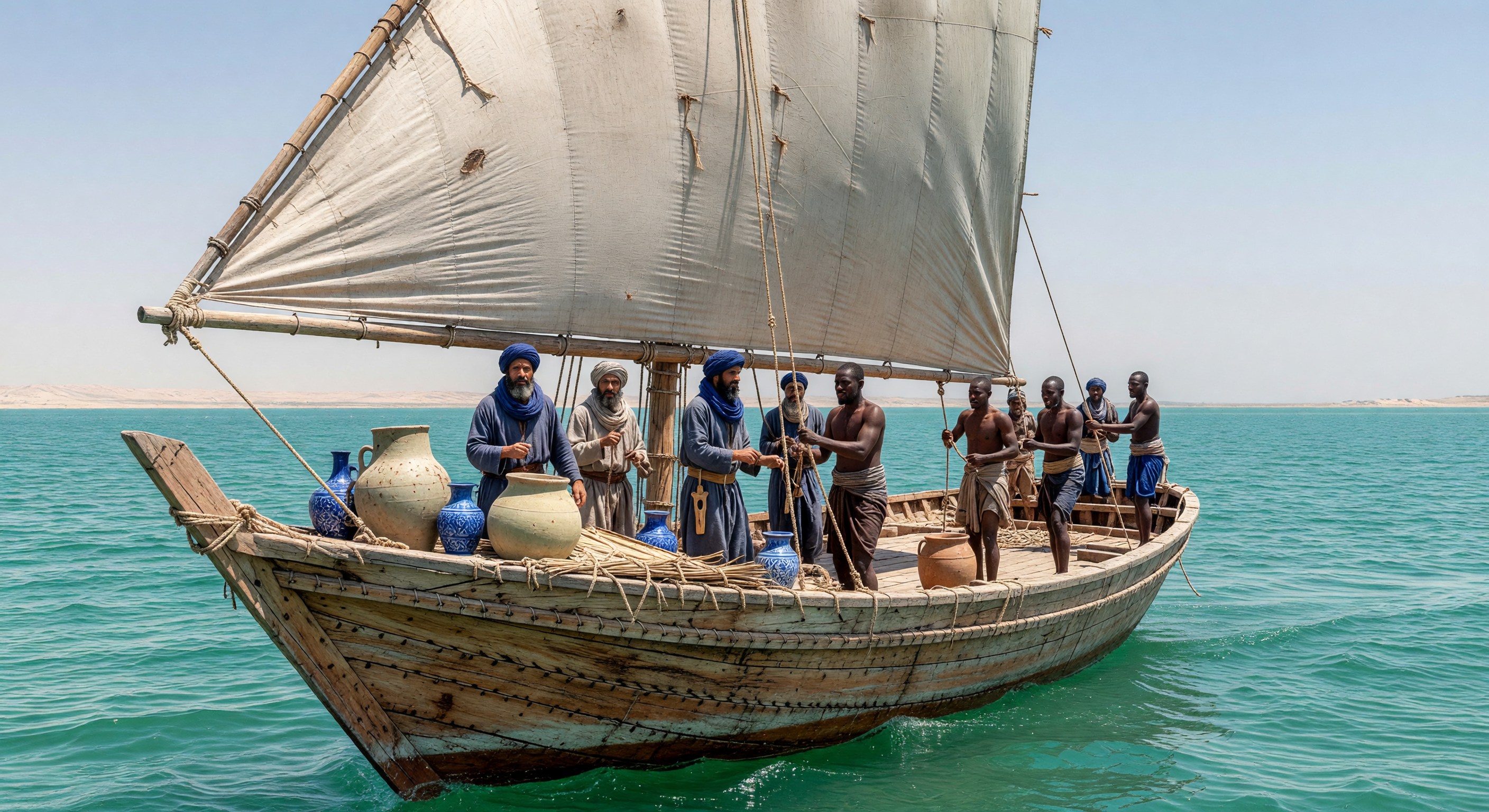 For the caption, “traditional sewn dhow” may be directionally correct for Indian Ocean wooden hull practice (sewed/pegged plank seams are plausible), but coconut-fiber twine is not supported by visible evidence in the image. “Sasanian-Islamic” blue-glazed jars is also problematic: Sasanians ended in the 7th century, so connecting them to a 9th-century Abbasid dhow needs careful phrasing (e.g., stylistic continuity rather than direct “Sasanian” labeling). Finally, the “Silk Road of the Sea” framing is acceptable as a common educational metaphor, but the caption over-specifies dates and artifact provenance.