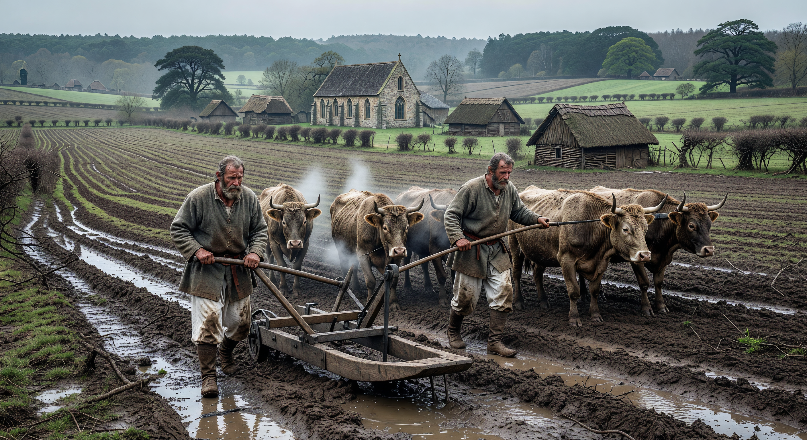 Caption: The caption’s core claim about peasants in 14th-century Northern Europe ploughing heavy clay is directionally correct, and ridge-and-furrow plus oxen aligns with typical medieval practices. The identification of the implement as a specific “carruca” with an iron coulter and wooden moldboard is the main concern: the image does not distinctly show those key technical features, and the number of animals (“team of four oxen”) is not clearly evidenced—often plough teams varied (and four-ox teams are plausible in some contexts but should be visually substantiated). The mention of the early Little Ice Age’s overcast skies is speculative: climate conditions in 14th-century Europe were regionally variable, and “overcast skies” cannot be scientifically tied to a specific local period from the image alone. The Gothic church + nucleated village is plausible, but again the region isn’t pinned down and the church/building details should match the claimed geography more carefully.