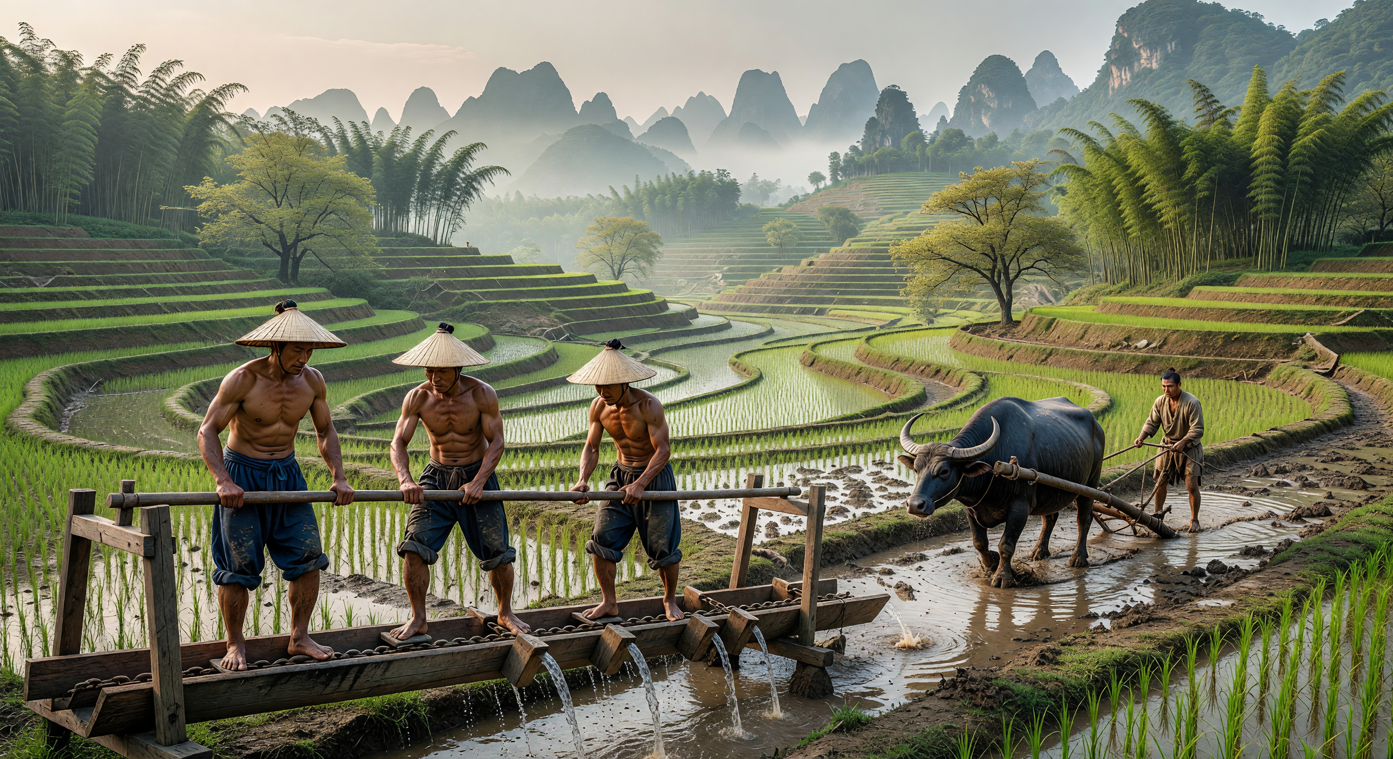 يظهر فلاحون صينيون من قومية الهان وهم يرتدون قبعات القش المخروطية ويشغلون "مضخة عظم التنين" الخشبية بأقدامهم، في مشهد يجسد نظام الري المبتكر في مدرجات الأرز الزمردية خلال عهد سلالة مينغ في القرن الخامس عشر. وفي الخلفية، يحرث جاموس ماء ضخم الأرض الطينية تحت ضباب قمم غوانغشي الكارستية، مما يعكس الإيقاع اليومي الشاق والمنظم للحياة الزراعية في أواخر العصور الوسطى بشرق آسيا. تبرز هذه الصورة البراعة الهندسية التقليدية والاعتماد العميق على الموارد الطبيعية التي كفلت استقرار وازدهار المجتمع الصيني آنذاك.