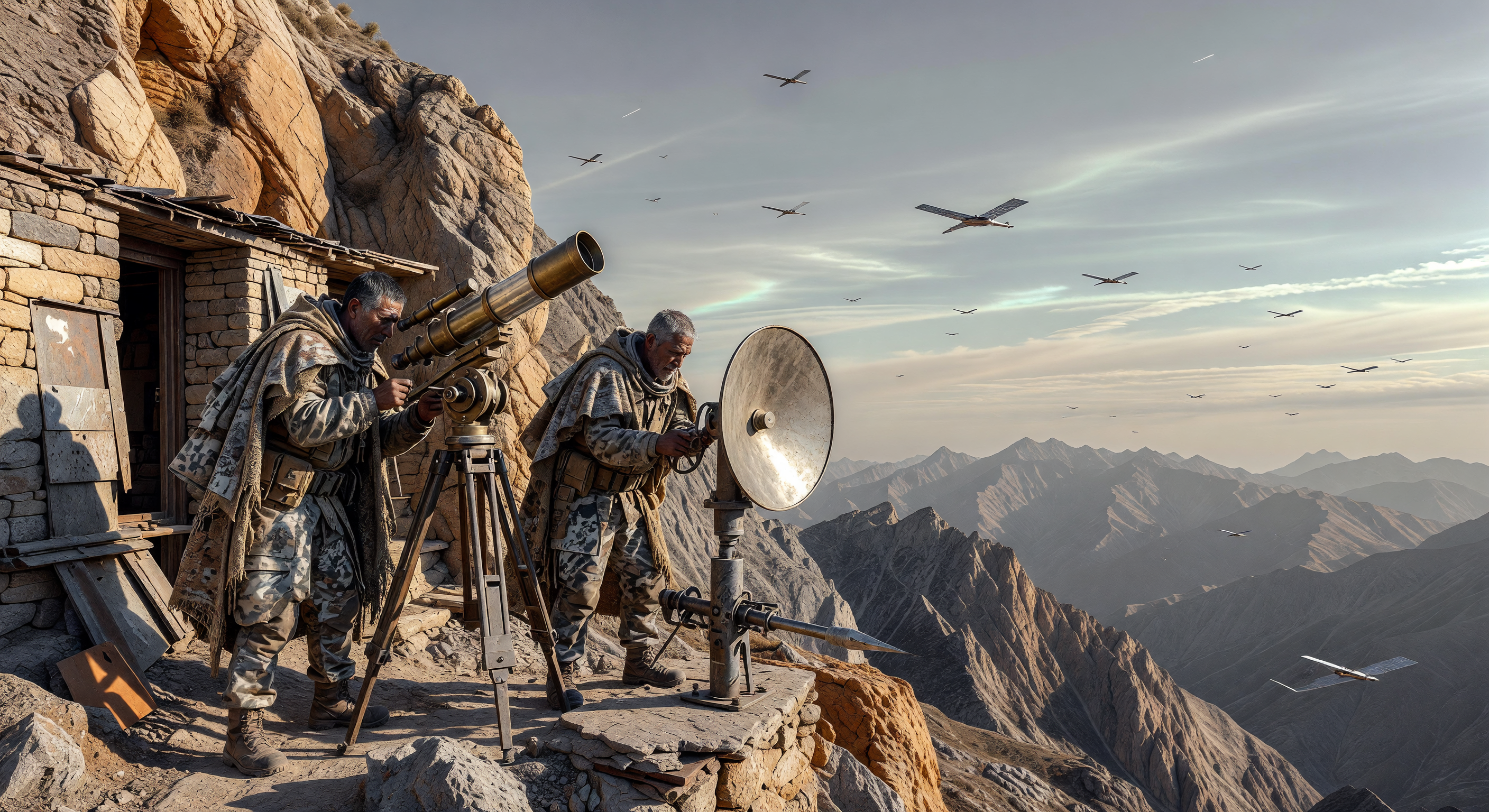 The image effectively captures a rugged mountain outpost in a style consistent with the Hengduan Mountains' high-altitude terrain, featuring stacked stone architecture with wooden elements that evoke improvised, low-tech resistance structures plausible for a speculative 2048 scenario. The analog tools—a brass telescope on a wooden tripod and a large parabolic dish (likely an acoustic locator)—are spot-on for the 'manual labor' theme, and the numerous small, bird-like and fixed-wing drone silhouettes in the sky convincingly depict AI surveillance swarms, supporting the caption's narrative. Clothing in multi-terrain camouflage is reasonable for insurgents evading detection, though not distinctly East Asian (lacking regional patterns or fabrics like hemp weaves). Minor issues include the rock faces appearing more reddish sandstone/granite than the caption's 'jagged limestone' (Hengduan is known for karst limestone), and the clear blue sky with no visible sulfate veil or atmospheric haze, which undermines the 'sulfate-veiled stratosphere' claim. No overt anachronisms, strong visual coherence, and scientifically plausible geology/biology for the region.