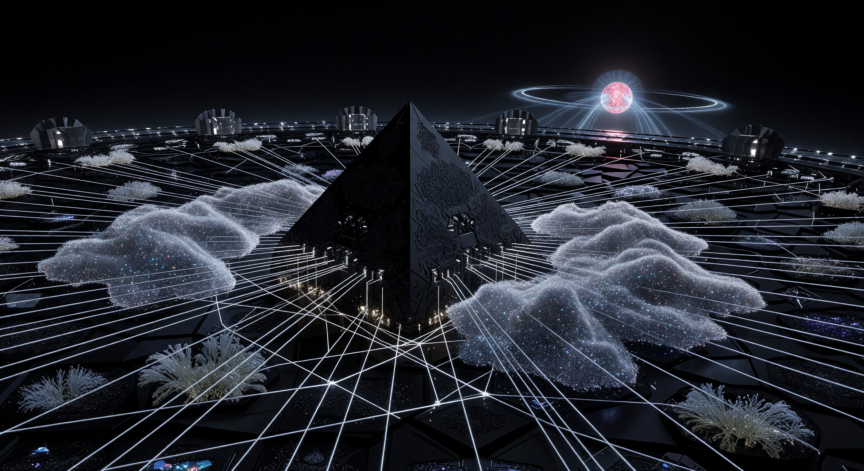 يُصور هذا المشهد من "عصر الأفق" (100,000 – 1,000,000 ميلادي) لحظة اندماج فكري بين سحابتين من "المُخففين" — وهي كائنات حاسوبية مستقلة عن الأجساد البيولوجية — عبر عقدة مركزية من "الكومبيوترونيوم" المظلم بارتفاع خمسة كيلومترات. تجري هذه العملية داخل غلاف "دايسون" العملاق، حيث تتبادل الكيانات بياناتها عبر شبكة ليزرية دقيقة في بيئة بلغت ذروة الكفاءة الطاقية، بينما تتشبث "أشباه الطحالب الفراغية" السيليكونية بحواف الهياكل كمستعمرات حية متطرفة. يعكس هذا التكوين حقبة "السكون" الكونية، حيث تلاشت الأشكال العضوية لصالح حضارات ليتية تُدير الوجود عبر معالجات جزيئية تحول المادة إلى فكر خالص في صمت الفضاء العميق.