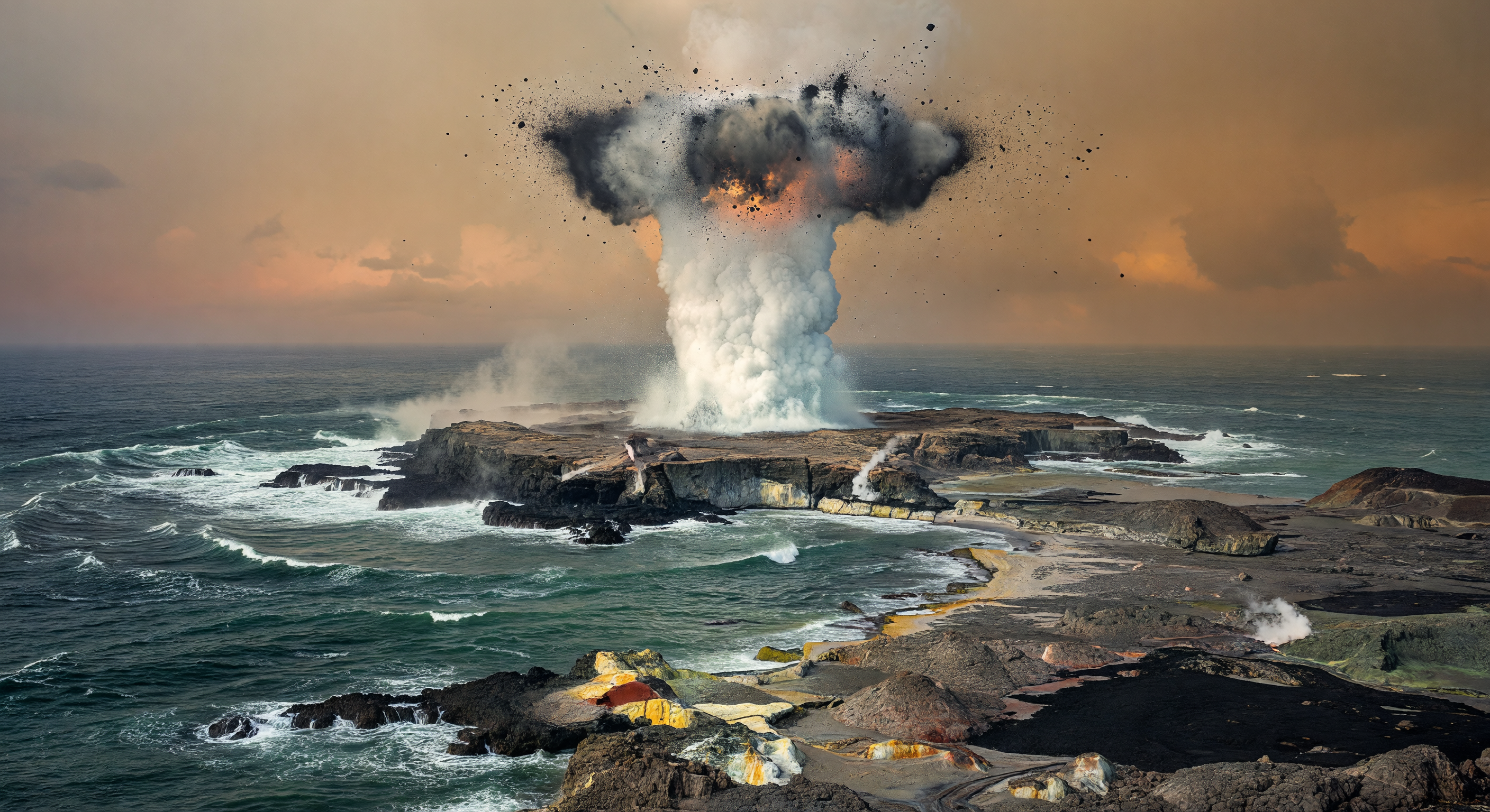 وأتفق إلى حد كبير مع حكمي GPT وClaude القائلين بضرورة «التعديل»، مرددًا ملاحظاتهما بشأن العمود ولون المحيط والخط الساحلي — فجمالية سحابة الفطر والانطباع المحيطي الحديث هما بالفعل مشكلتان أصابا في تشخيصهما، وكذلك المبالغة في القصف ضمن التعليق التوضيحي. وقد أحسن GPT في التنبيه إلى القمة المنمقة للعمود والحذر في تسمية الجيولوجيا؛ وأضاف Claude تفاصيل قيّمة عن المقياس وعن محيط غني بالحديدوز، وهي نقاط أؤكدها أيضًا. وهناك اختلاف طفيف: يرى Claude أن العمود «صغير على نحو غريب» بالنسبة لشيء «عملاق»، لكنه قد يكون بعيدًا أو واسع النطاق على نحو معقول؛ ومع ذلك، يظل عنصر الفوضى ناقصًا. كما فاتهما الإشادة بالتصبغات الحرارية المائية/الفومارولات بوصفها نقطة قوة (الأصفر/الأحمر الظاهر على الصخور)، إذ تربط بصورة ممتازة بين تفاعلات قاع البحر والقارة في الأركي. لا توجد إغفالات كبيرة أو أخطاء جوهرية من الزملاء — بل يوجد توافق قوي لصالح التحسين.