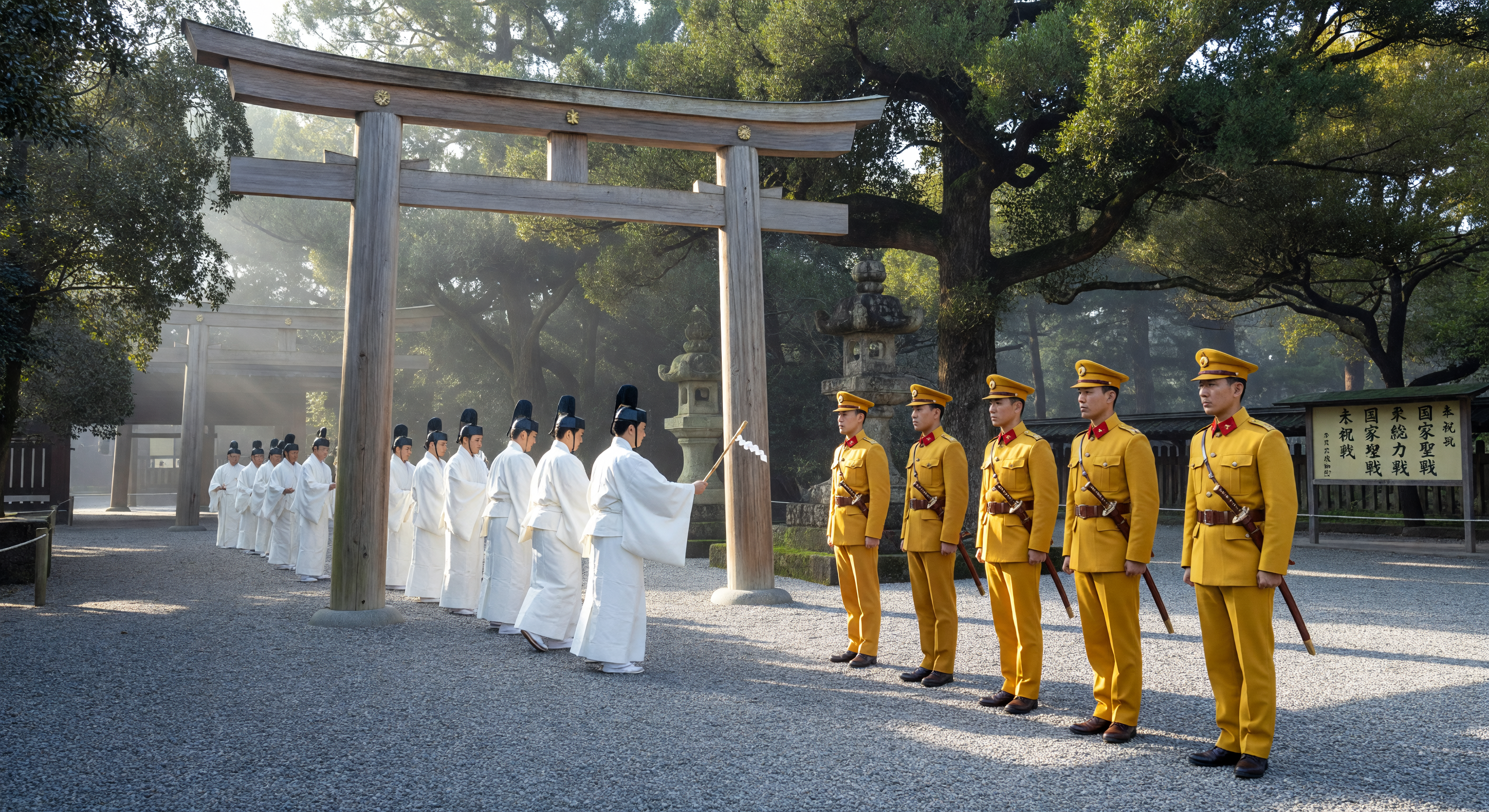يقف ضباط الجيش الإمبراطوري الياباني بزيّهم العسكري الصوفي الأصفر في انضباط صارم أمام بوابة "توري" ضخمة من خشب الأرز، بينما يؤدي كهنة "الشنتو" بملابسهم الحريرية البيضاء طقوس التطهير وسط ضباب الصباح في طوكيو خلال أوائل الأربعينيات. يعكس هذا المشهد التلاحم العميق بين المؤسسة العسكرية وعقيدة "شنتو الدولة" التي كانت ركيزة أساسية لتعزيز القومية والولاء المطلق للإمبراطور خلال الحرب العالمية الثانية. يجسد التباين بين صرامة البدلات العسكرية ووقار الطقوس الدينية الأجواء المهيبة التي سادت اليابان في عهد "شووا"، حيث امتزجت التقاليد العريقة بطموحات التوسع الإمبراطوري.