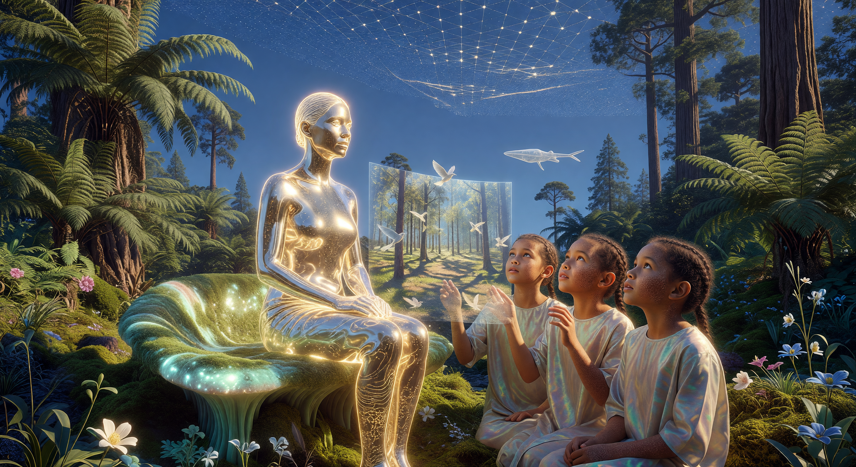 في حقبة "النضج الكوني" (حوالي 24,500 - 102,000 ميلادي)، تظهر "صدى" (Echo)—وهي وعي رقمي متجسد عبر إسقاط ضوئي صلب—وهي تشارك أطفالاً من "البشر الأنقياء" (Bio-Pure) ذاكرة هولوغرافية لغابة من القرن الحادي والعشرين وسط بيئة أرضية مستعادة تحاكي العصر الحديث الأقرب (Pleistocene-Plus). تحت سماء يزينها "مصفوفة سول النجمية" التي تحيط بالشمس، تجلس المجموعة على تكوينات فطرية حيوية، مما يبرز التناغم الفريد بين التكنولوجيا الفوتونية المتقدمة والنظم البيئية التي أُعيدت إلى توازنها الطبيعي. يجسد هذا المشهد دور الأرض كـ "كوكب متحفي" يحفظ التراث البيولوجي والمعرفي للبشرية عبر آلاف السنين في ظل استقرار مناخي تام.