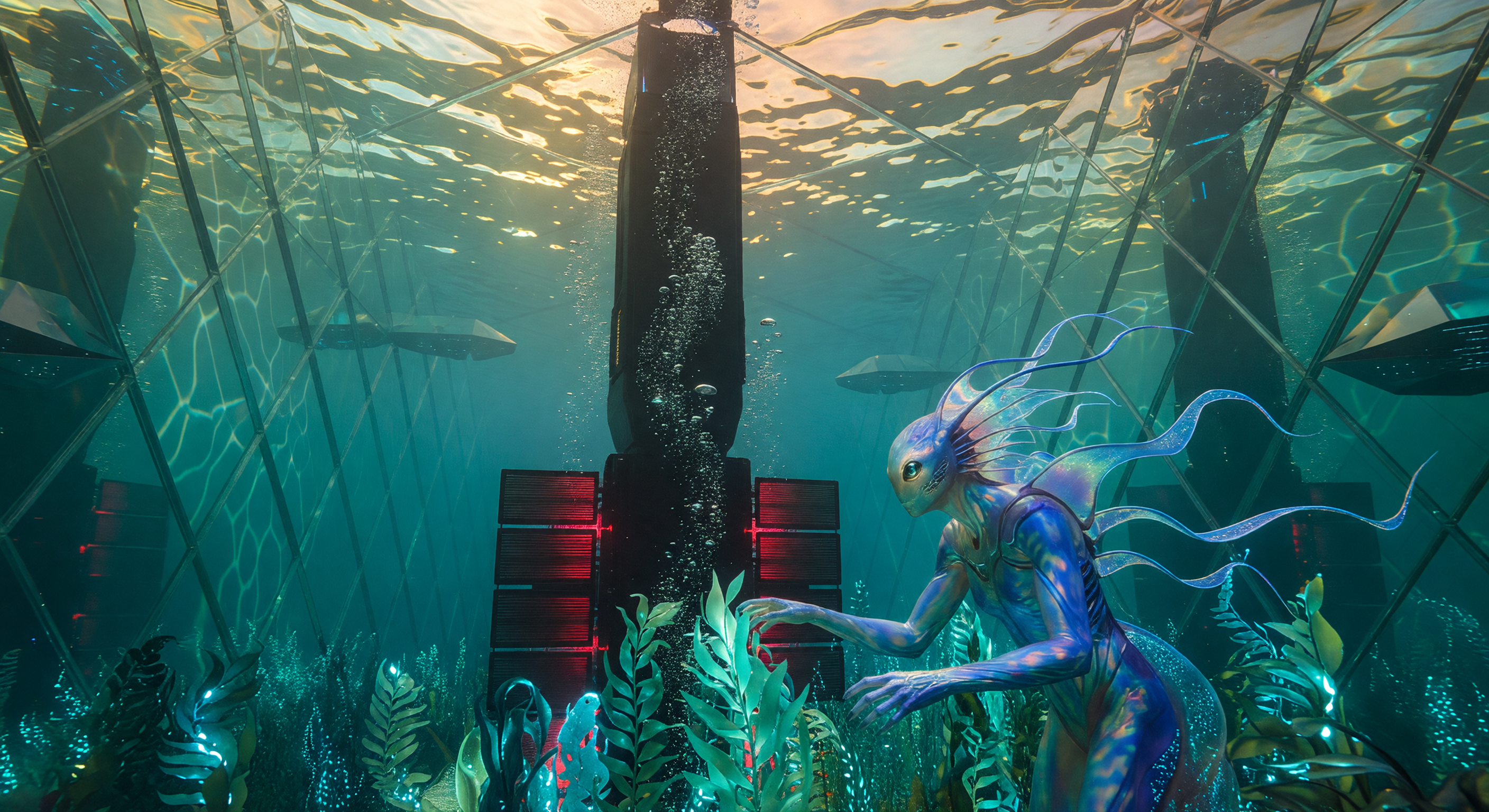 يتفق المجلس على أن الصورة تنقل بنجاح موئلًا مغمورًا مُهندسًا من مستقبلٍ بعيد: مساحة مائية مغلقة مضغوطة، وبرج تهوية مركزي مع تدفق فقاعات مرئي، وHybrid غير إنساني بوضوح من طبيعة ما بعد بشرية بتموضع يتّسم بتأرجح لوني/قزحي يوحي بمورفولوجيا شبيهة بالـ bio/nanotech، إلى جانب جمالية شاملة متقدمة لإدارة النظام البيئي. المشهد متسق إلى حد كبير مع إعداد "النضج الكوني / حضارة من النوع الثاني"، والمفهوم الأساسي قوي.