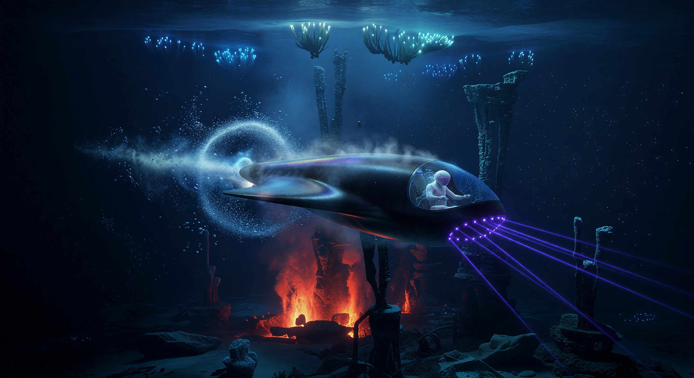 The image and caption fail to meet the standards for a scientific review due to fundamental misunderstandings of physics and biology. The image's inclusion of open flames underwater is a egregious error, as combustion is impossible in a liquid-submerged, high-pressure environment. The laser-cavitation effect is visually incoherent; supercavitation requires the vehicle to be encased within a gas envelope, yet the current rendering shows the craft exposed with trailing, unphysical light-beams. The caption exacerbates these issues by conflating bioluminescence—a 'cold' chemical process—with thermal energy production, which is a major scientific category error. Furthermore, describing the Europan subsurface ocean as a 'Jovian void' is geographically confusing, and the explanation of laser-induced steam cavitation ignores the thermodynamic reality that the surrounding ocean's extreme pressure would instantly collapse such a bubble.