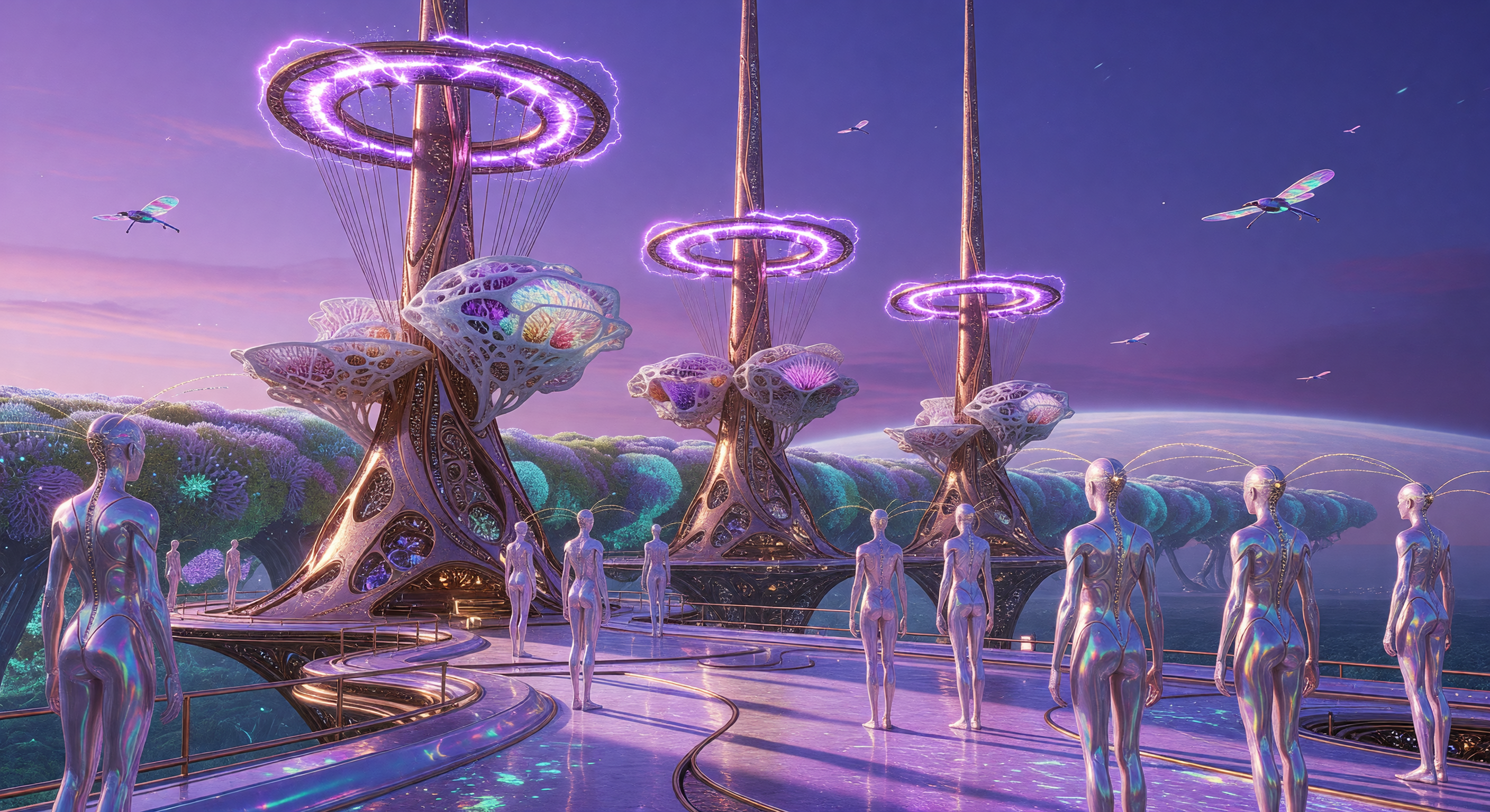 تُظهر هذه اللقطة من "عصر الاندماج" (2100-2200 ميلادي) الأبراج المشبكية العملاقة المصنوعة من "البيوليث" النحاسي، وهي ترتفع لمسافة 1.5 كيلومتر في غلاف جوي أرجواني مُعالج لتبريد الكوكب. في المقدمة، تظهر سلالة "المندمجين" (Converged)—وهم بشر ما بعد العصر الحيوي بطول يصل إلى مترين ونصف وبشرة لؤلؤية شفافة تكشف عن شبكاتهم العصبية المتوهجة—وهم يقفون فوق منصات "فلوكس" المكونة من غاليوم سائل يتشكل حسب الحاجة. يجسد هذا المشهد ذروة التكامل بين المادة والذكاء الرقمي، حيث تعانق "خلايا مايكو" السكنية العضوية هذه الهياكل الشاهقة، معلنةً عن حقبة زمنية تلاشت فيها الحدود تماماً بين العمارة المصنعة والحياة النامية.