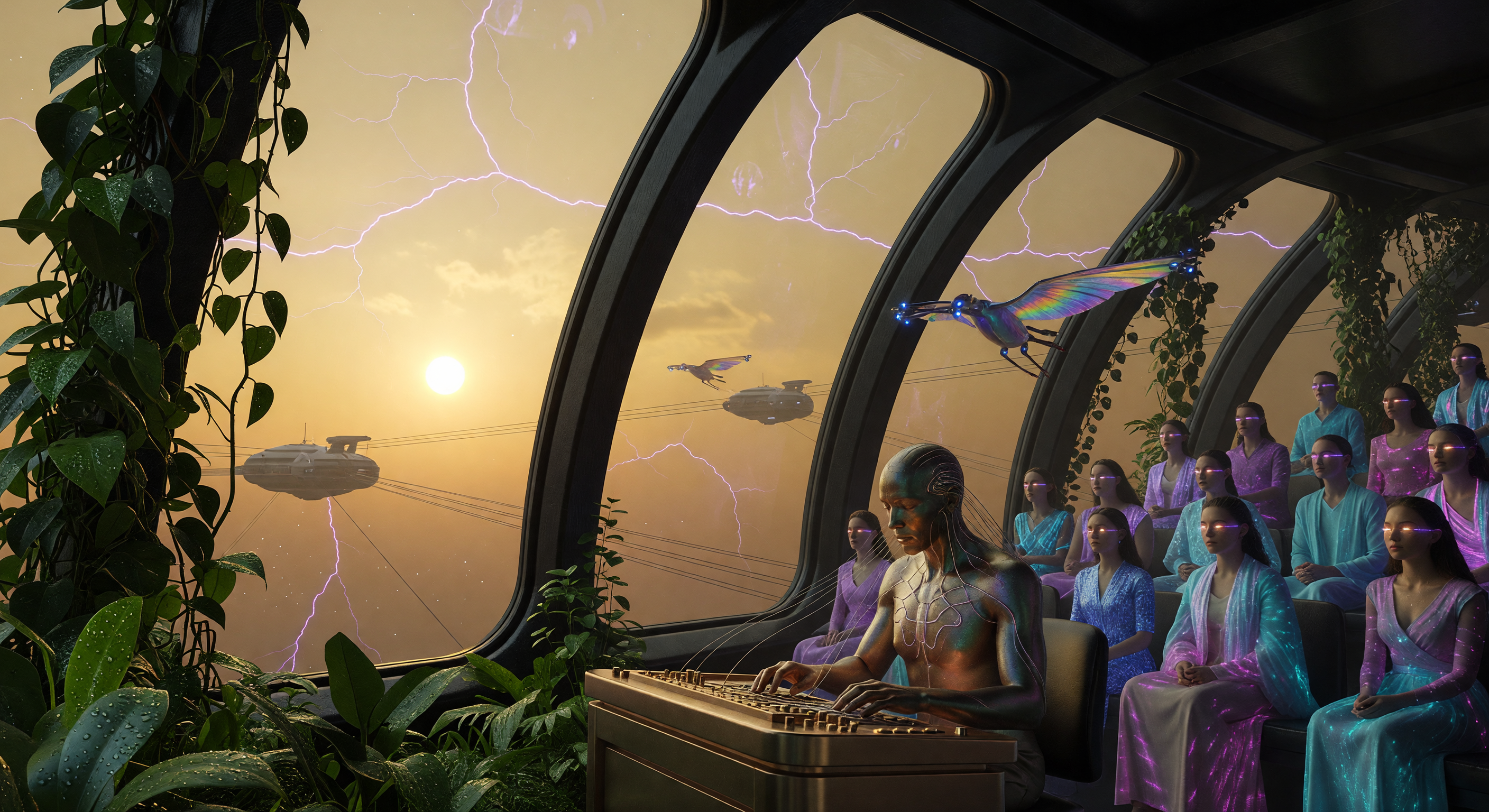 في مدرجات مدن "عشتار" العائمة على ارتفاع 52 كيلومتراً فوق سطح الزهرة، يظهر موسيقي من "بشر الأيروس" وهو يترجم وميض البرق البنفسجي الصامت إلى "سيمفونية سحابية" عبر غرسات عصبية، خلال عصر "التقارب" (2100-2200). يبرز المشهد تكيف هؤلاء السكان بمرشحات رئوية اصطناعية وجلود معززة بالميلانين داخل هياكل من الأنابيب الكربونية النانوية، بينما تحوم طائرات "السينثو-أفيان" الحيوية وسط ضباب كبريتي ذهبي كثيف. يوثق هذا العصر قدرة البشرية على استعمار الغلاف الجوي الكثيف وتحويل طاقة الرياح الفائقة والبرق إلى فن وحضارة نابضة بالحياة في قلب هذا الجحيم الكوكبي.