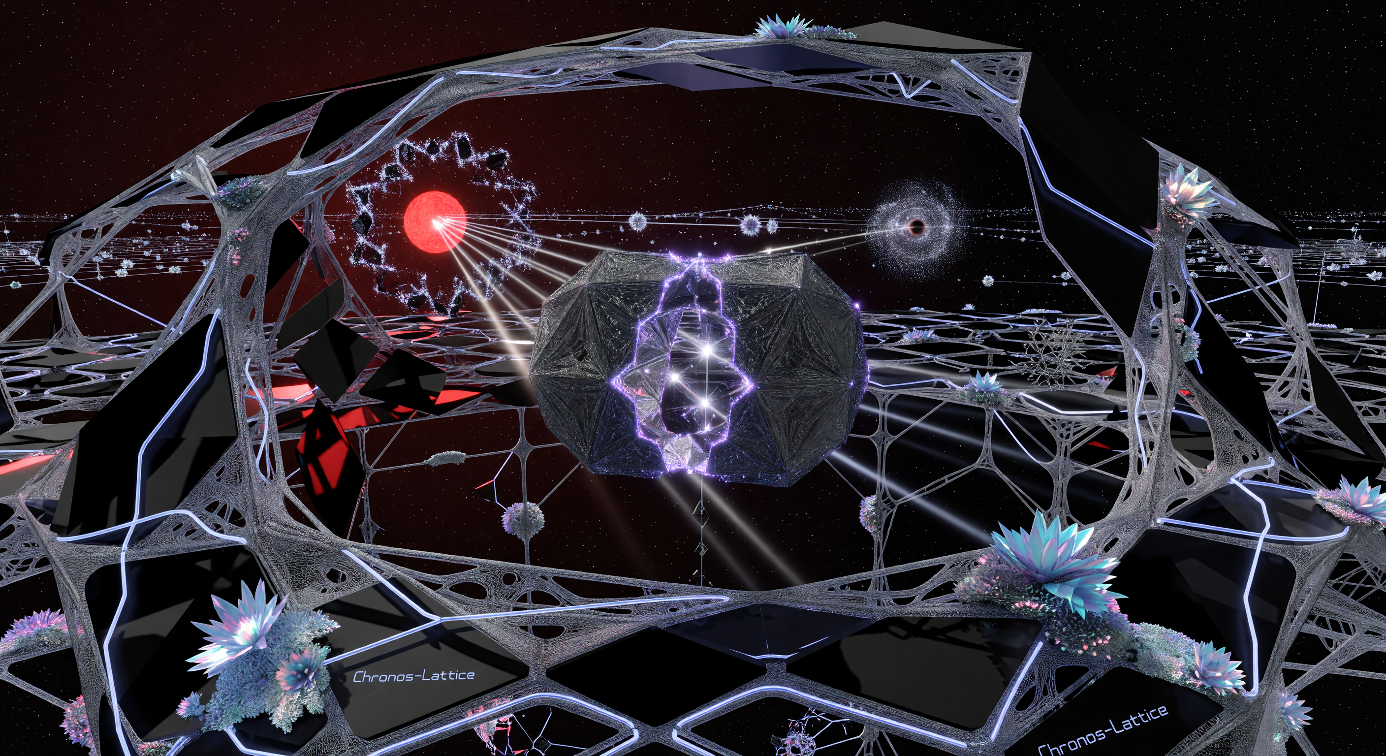 The image effectively captures a speculative post-biological aesthetic for the Interstellar Dawn period near Barnard's Star, with its intricate lattice structures labeled 'Chronos-Lattice,' shimmering geometric polyhedrons at the center undergoing a luminous 'Data-Merge' (purple energy pulses), and a dim red star in the background plausibly representing the crimson glow of a red dwarf like Barnard's. The obsidian-black framework and neon accents evoke carbon-nanotube architecture in a cold, vacuum-like computational environment, aligning with radical minimalism and infrared-pulse communication visuals. However, iridescent, crystalline 'flower'-like growths scattered throughout (e.g., blue-white plumes on the lattice) introduce organic-analog ornamentation that contradicts the transcendence of organic form and undermines minimalism. The small black circle with an accretion disk in the upper right suggests 'harvested black hole energy' but appears implausibly proximate and scaled for a stellar system like Barnard's (6 light-years away, no known black holes), risking astrophysical incoherence. No anachronisms, but minor refinements could stylize or remove the flora elements and contextualize the black hole as a distant or simulated feature for better plausibility.