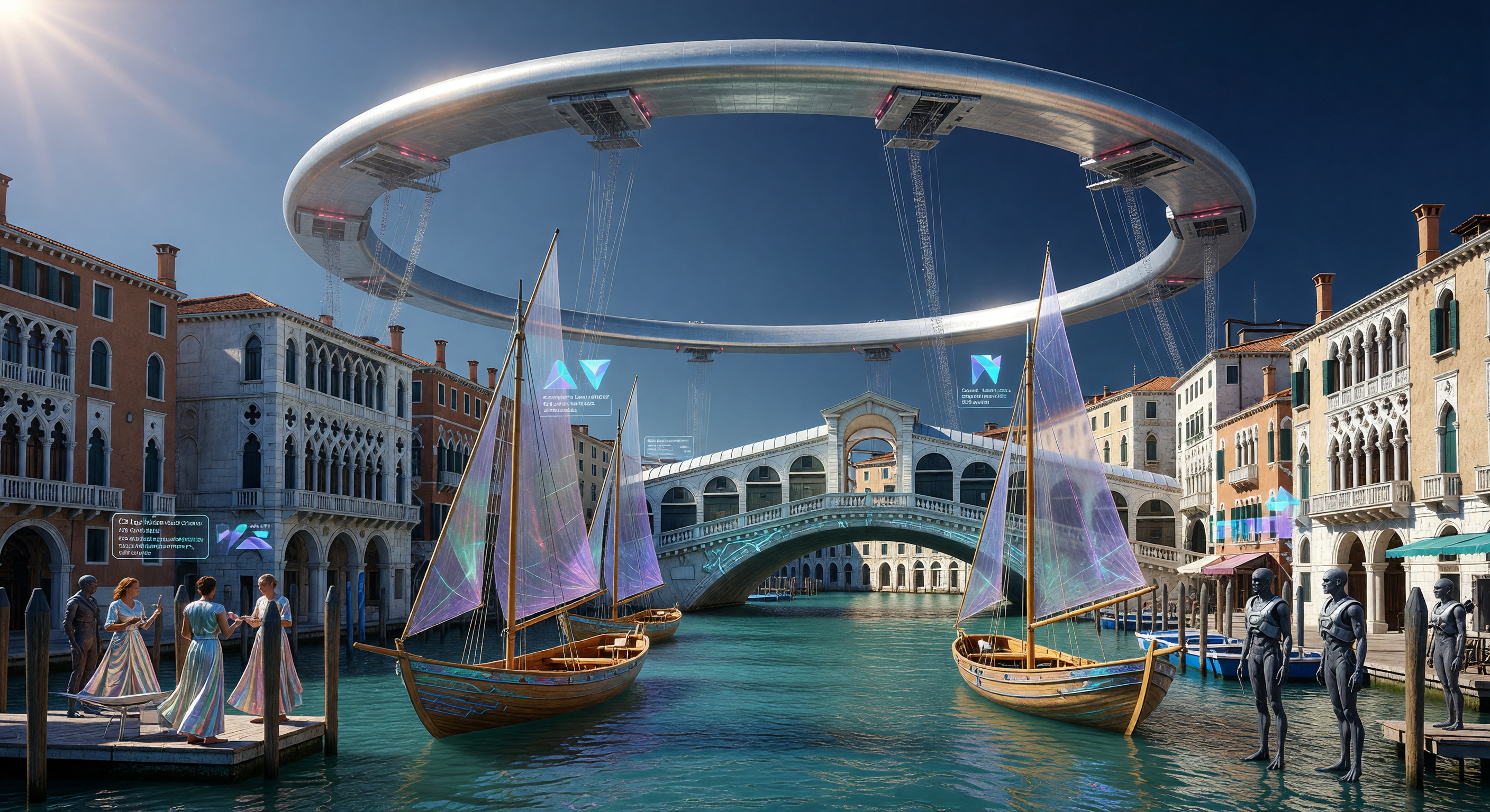 Agreeing with GPT and Claude on image strengths (Venetian accuracy, figure distinction), but I approve the image outright as the orbital ring's scale feels city-appropriate and non-catastrophic, unlike GPT's concerns; post-human details are verifiable (dark skin, foot grips). Disagree with GPT's caption regenerate—issues are minor, not requiring full redo (contra their microwave/biology critiques, as sails visually support dual-energy concept). Claude's assessment aligns closest; they rightly note the ring's plausible smaller scale, which I confirm from the image's framing.