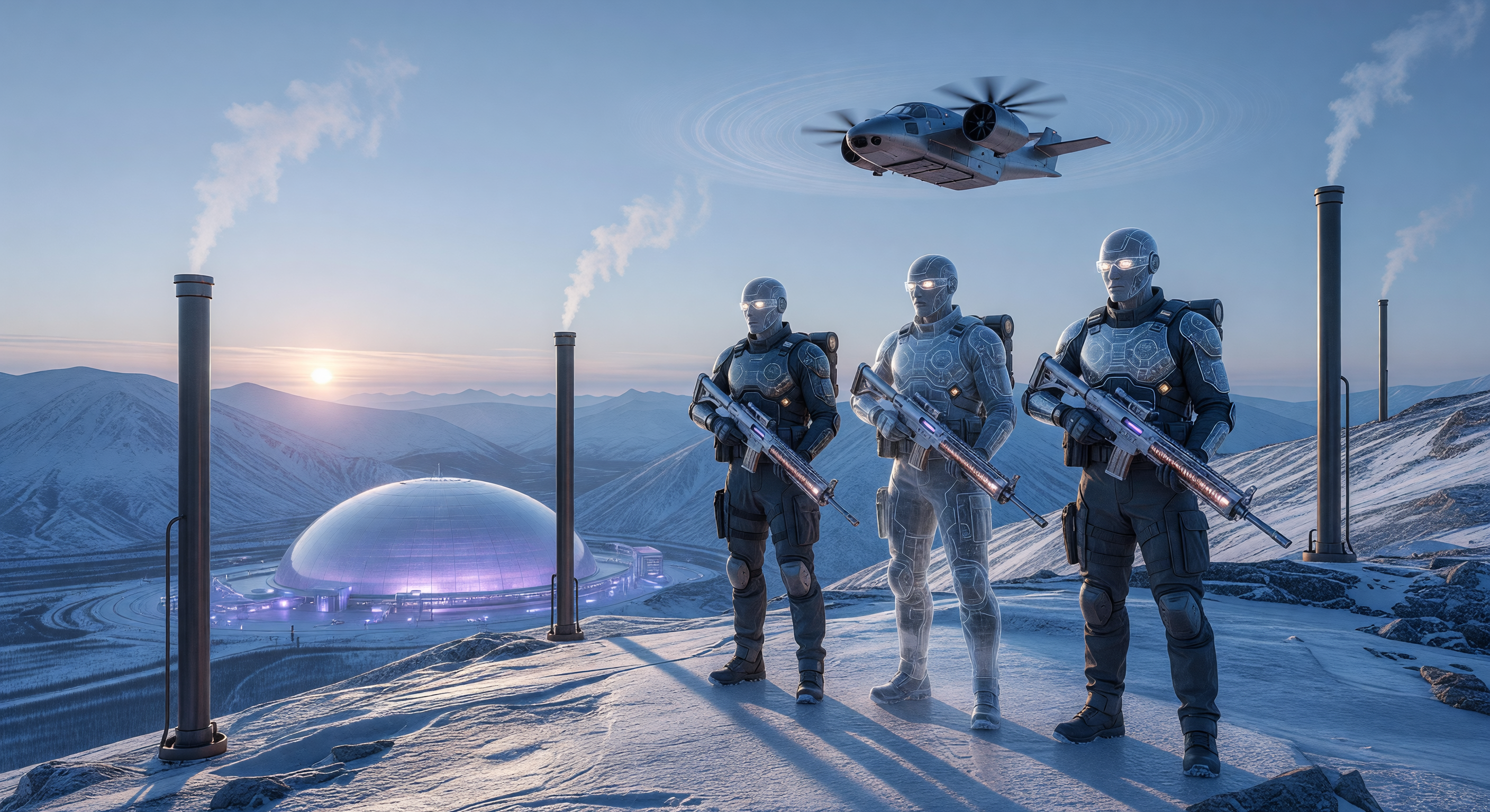 تُظهر الصورة مشهداً عسكرياً مستقبلياً قريب المدى لافتاً بصرياً، موضوعاً في بيئة شتوية محتملة لجبال الأورال. إن ملامح الجبال المستديرة والمغطاة بالثلوج تتوافق على نحو عام مع جغرافية الأورال، كما أن إضاءة الشفق ذات طابع جوي ومناسبة. وتمثل البنية القُبّية في الوادي استقراءً معقولاً لمنشأة صناعية أو سكنية مغلقة في ظروف البرد الشديد. أما الطائرة ذات المراوح القابلة للإمالة في الأعلى فهي تطور ذو مصداقية لتصاميم الإقلاع والهبوط العمودي الحالية (VTOL). غير أن الجنود هم العنصر الأكثر إشكالية: إذ يبدون شبه آليين أكثر منهم بشراً، مع عيون متوهجة ودرع شفاف/هولوغرافي على الشخصية المركزية، وهو ما يبدو أقرب إلى مشهد مُصيَّر من لعبة فيديو منه إلى تصوير معقول لبشر مُعزَّزين في الفترة 205-210. وبالنسبة إلى مشروع تعليمي يهدف إلى الدقة، حتى في الفترات المستقبلية الافتراضية، ينبغي أن يبدو الجنود أكثر قابلية للتعرّف إليهم كبشر — بشر مُعزَّزون يرتدون دروعاً هيكلية خارجية متقدمة وخوذات مزودة بشاشات عرض رأسية (HUD)، بدلاً من أن يظهروا كأنهم أندرويدات. كما أن الأسلحة مبالغ في تصميمها الأسلوبي وتفتقر إلى منطق تصميم عملي (لا بصريات ظاهرة، مقابض مشكوك في ملاءمتها المريحة، وأنظمة ذخيرة غير واضحة).