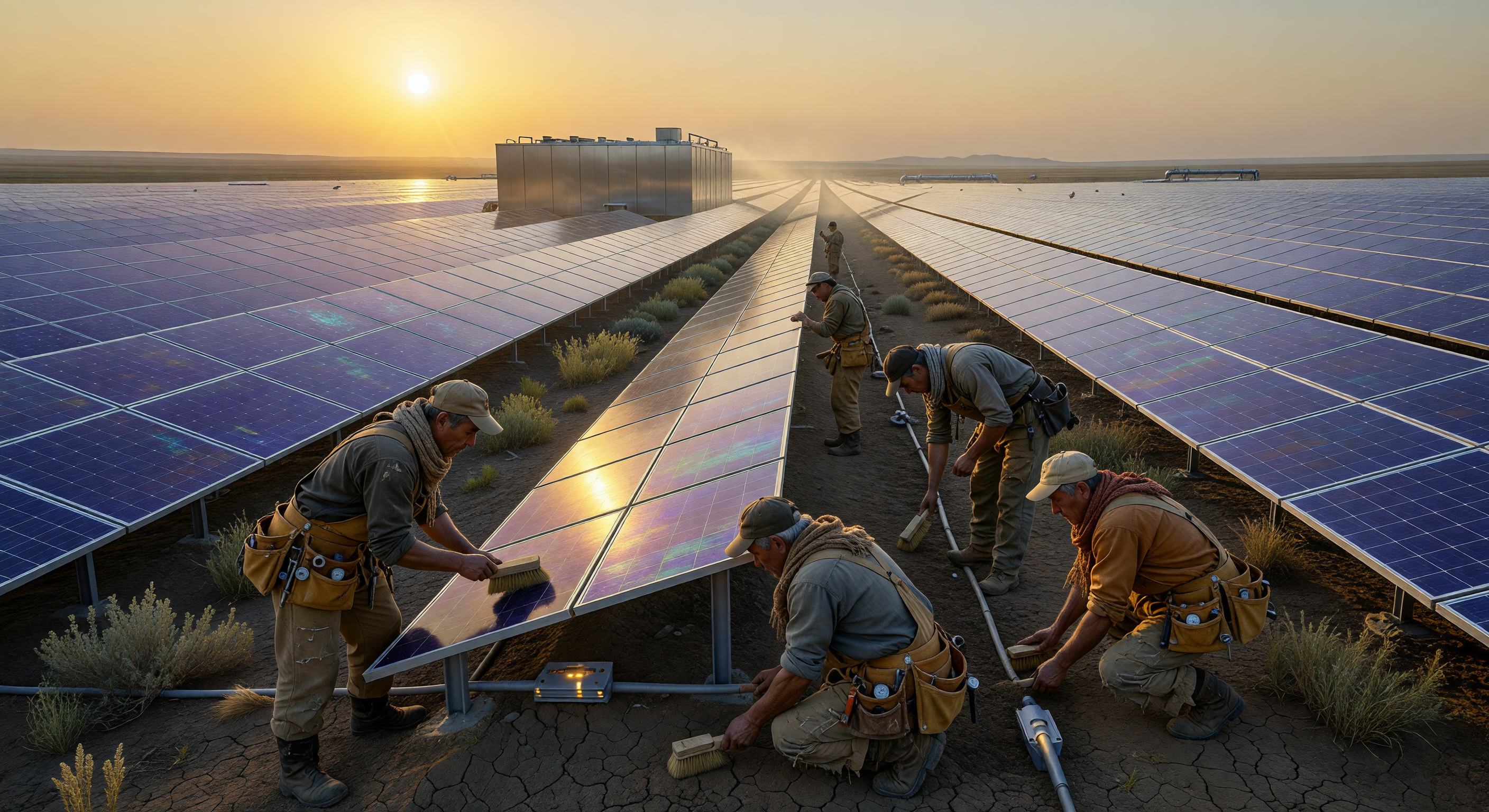 الصورة جذابة بصريًا وتنجح بدرجة معقولة في نقل مشهد لبنية تحتية شمسية من مستقبل قريب في ما يبدو بشكل معقول أنه سهوب آسيا الوسطى. إن التضاريس المسطحة والقاحلة، مع الأرض المتشققة، والغطاء النباتي الشجيري المتناثر، والأفق الضبابي، تتسق مع بيئة السهوب الكازاخية. أما ملابس العمال — وهي معدات عمل عملية تتضمن أحزمة أدوات، وقبعات، وقمصانًا متعددة الطبقات — فهي معقولة ضمن جمالية «وظيفية خشنة» تعود إلى منتصف القرن الحادي والعشرين إلى أواخره، مع أن مظهرهم لا يبدو كازاخيًا أو من آسيا الوسطى على نحو محدد. وتبدو ملامح وجوه العمال الظاهرين أوراسية عامة أكثر من كونها كازاخية/تركية الطابع على وجه التحديد، وهو ما يثير ملاحظة طفيفة تتعلق بالدقة الثقافية. وتُظهر الألواح الشمسية سمة قزحية خفيفة قد تشير إلى خلايا ترادفية من البيروفسكايت والسيليكون، وهي تفصيلة تخمينية لطيفة تنسجم مع تكنولوجيا كهروضوئية واقعية لمستقبل قريب. ويمكن بشكل معقول أن تكون البنية المعدنية الكبيرة في الخلفية منشأة لتخزين الطاقة أو توزيعها. وبوجه عام، تعمل الصورة جيدًا، لكنها كانت ستستفيد من علامات ثقافية أكثر تحديدًا — ربما عناصر كازاخية تقليدية مدمجة في لباس العمال أو دلالات ثقافية مرئية في الخلفية.