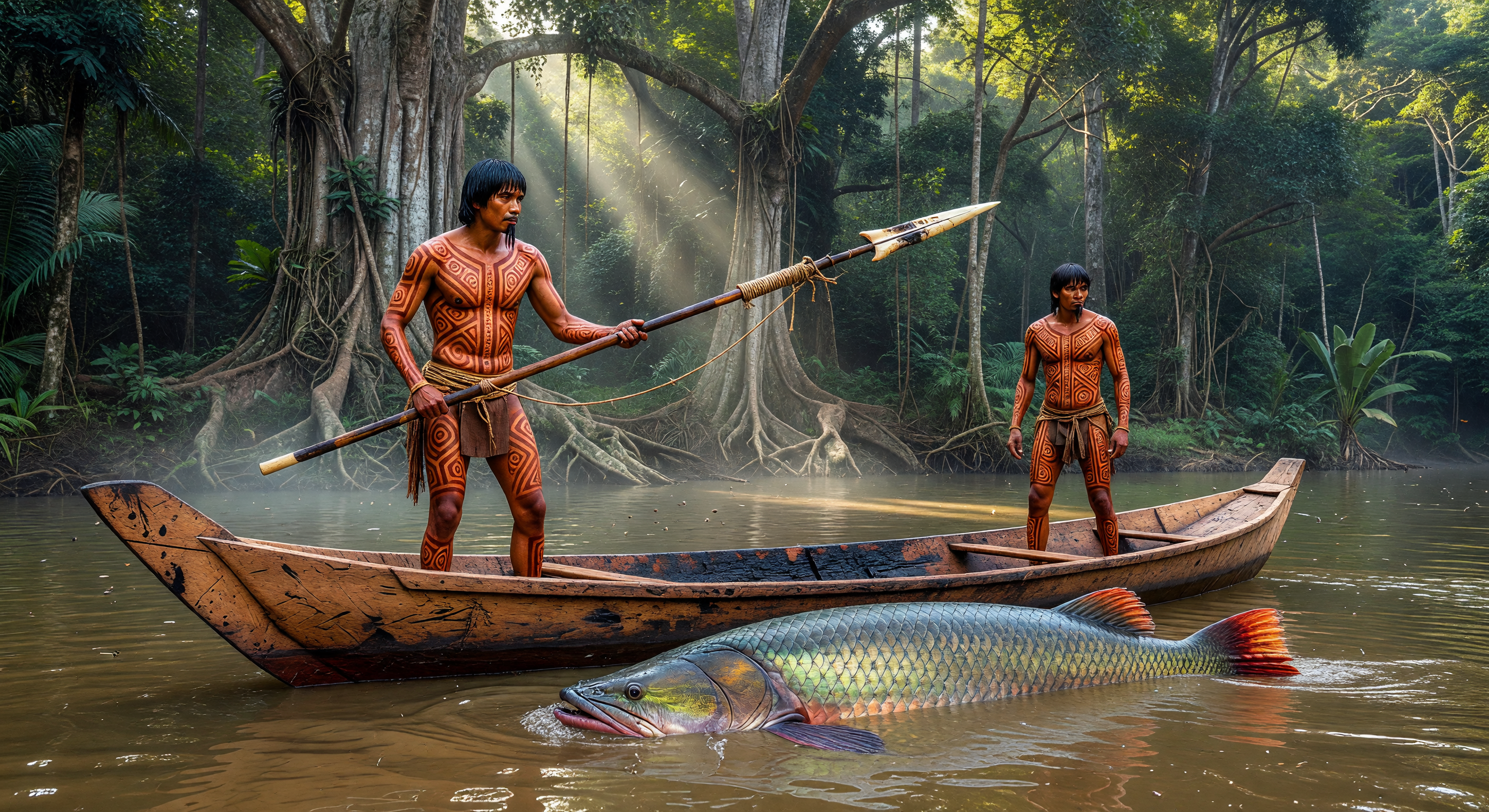The image is a strong, visually coherent reconstruction of pre-contact Amazonian fishing practices. The landscape accurately captures the Amazon basin with buttressed trees, aerial roots, dense tropical foliage, and murky riverine waters, all geologically and ecologically plausible for lowland South America. The cedar dugout canoe shows realistic fire-hollowed construction with charred interior and simple wooden form, consistent with indigenous techniques using local hardwoods. The two men have culturally appropriate reddish urucum (annatto) body paint in geometric patterns that align with Tupi-Guarani tattooing and painting traditions, though rendered symmetrically for artistic effect; they are minimally adorned with loincloths, fitting the period. The massive Arapaima gigas is scientifically spot-on, with iridescent scales, large mouth, and orange-red tail fin matching the species' biology. Spears appear bone- or wood-tipped with fiber cordage suggesting harpoon use, plausible for the region. No anachronisms detected—everything evokes 16th-century subsistence fishing without European influences. Minor nit: labrets are not distinctly visible, but this doesn't undermine the overall accuracy and plausibility.