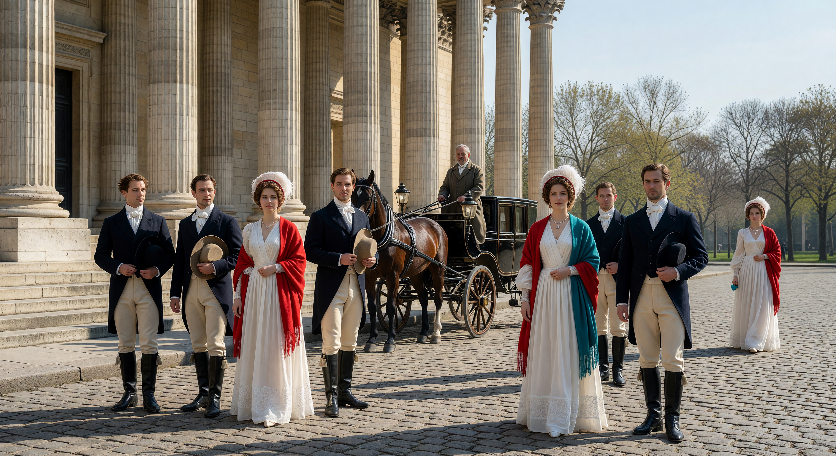 The image accurately depicts the Panthéon’s Neoclassical portico with its Corinthian columns and pediment, which was completed in 179 and fits perfectly for 181 Paris during the First French Empire. Women's high-waisted muslin gowns with shawls evoke the Empire silhouette, influenced by Greco-Roman revival, and the men's dark tailcoats, breeches, and boots are period-appropriate for elite fashion. The cobblestone plaza and budding trees suggest a plausible spring day in temperate Europe, with no glaring anachronisms in architecture, landscape, or biology. However, the carriage is problematic: its design resembles a later 19th-century landau or cabriolet with a somewhat sleek body and visible spoked wheels, rather than the chunkier, open barouches or cabriolets typical of Napoleonic Paris; the coachman's attire also leans generic/modern. Posing is overly theatrical and static, like a costume drama still (e.g., Bridgerton-esque), lacking the candid dynamism of real street strolling, and headpieces on women are exaggeratedly large and feathered, more caricature than everyday elite wear.