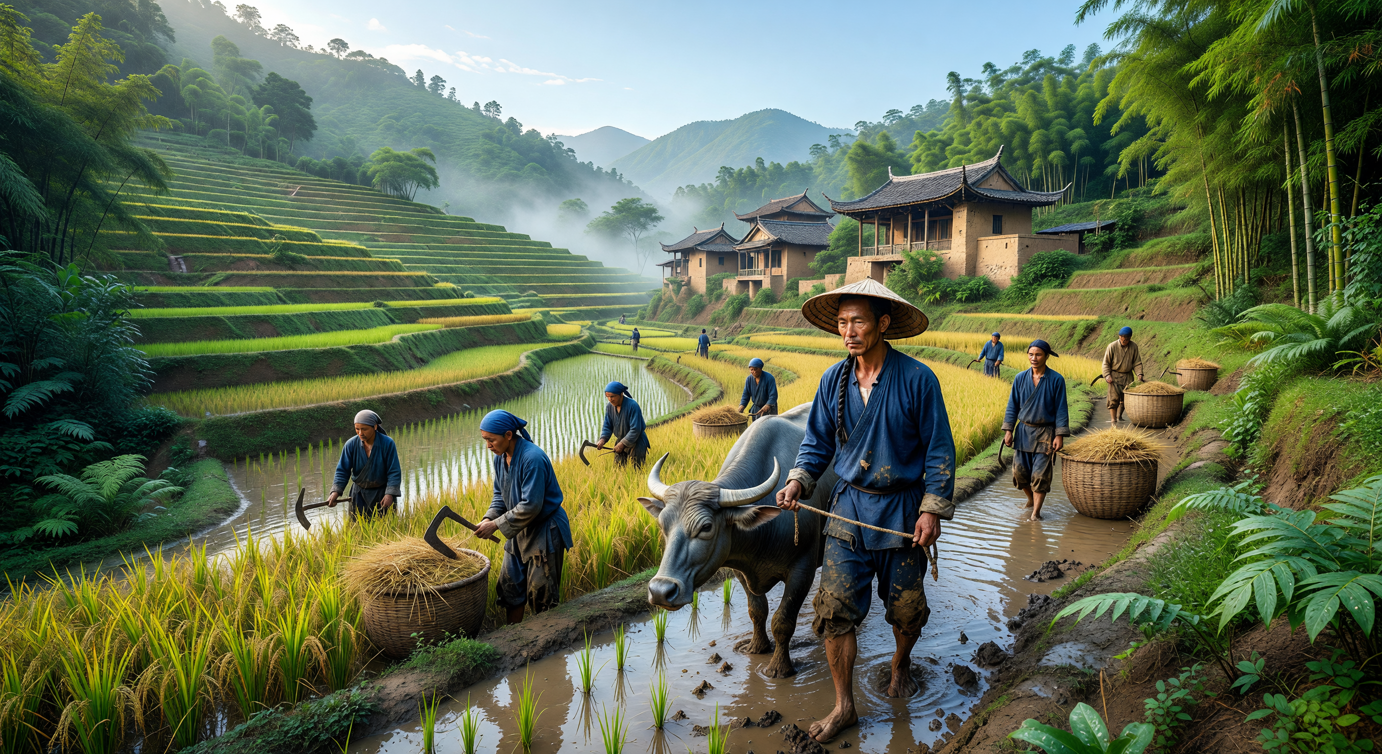 In this scene from the late 19th-century Qing Dynasty, Han Chinese farmers and water buffalo navigate the intricate Hani rice terraces of Yunnan province during the morning harvest. The laborers are depicted wearing traditional indigo-dyed cotton and the mandatory Manchu queue, a hairstyle enforced by the ruling dynasty until 1912. These vast, hand-carved landscapes reflect a sophisticated agricultural heritage that remained the backbone of rural life in Southern China, even as coastal regions began to experience the industrial shifts of the Belle Époque.