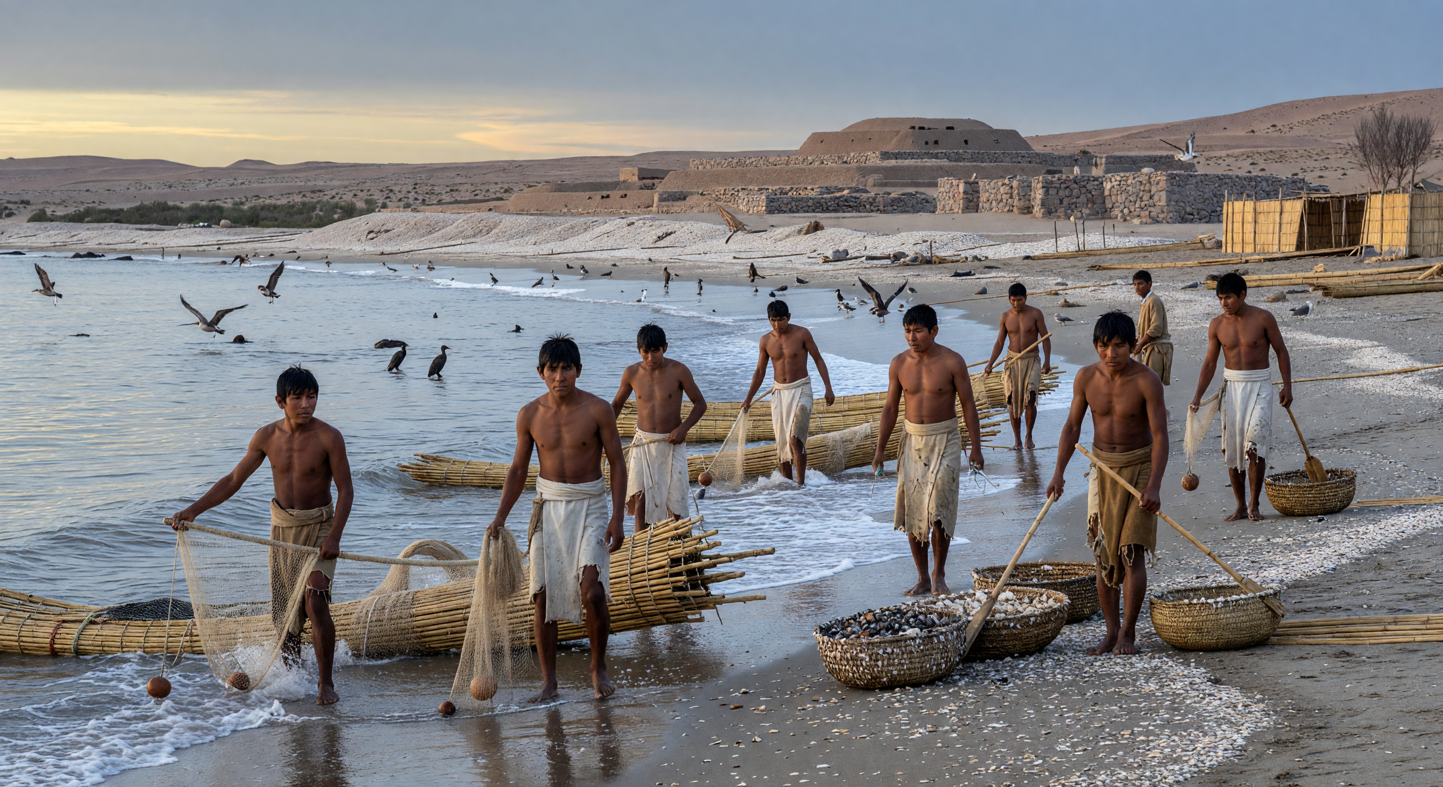 At first light on the arid coast of ancient Peru, Indigenous fishers at Áspero push bundled totora reed craft into the cold Pacific while carrying cotton nets, gourd floats, and baskets filled with shellfish along a shoreline layered with shell middens. This scene reflects the maritime foundations of the Norte Chico or Caral-Supe world, where rich fisheries and cotton net production helped sustain some of the earliest monumental centers in the Americas. In the distance, low stone platform mounds and work shelters evoke Áspero’s late Preceramic ceremonial landscape, built without metal, writing, or wheeled transport.