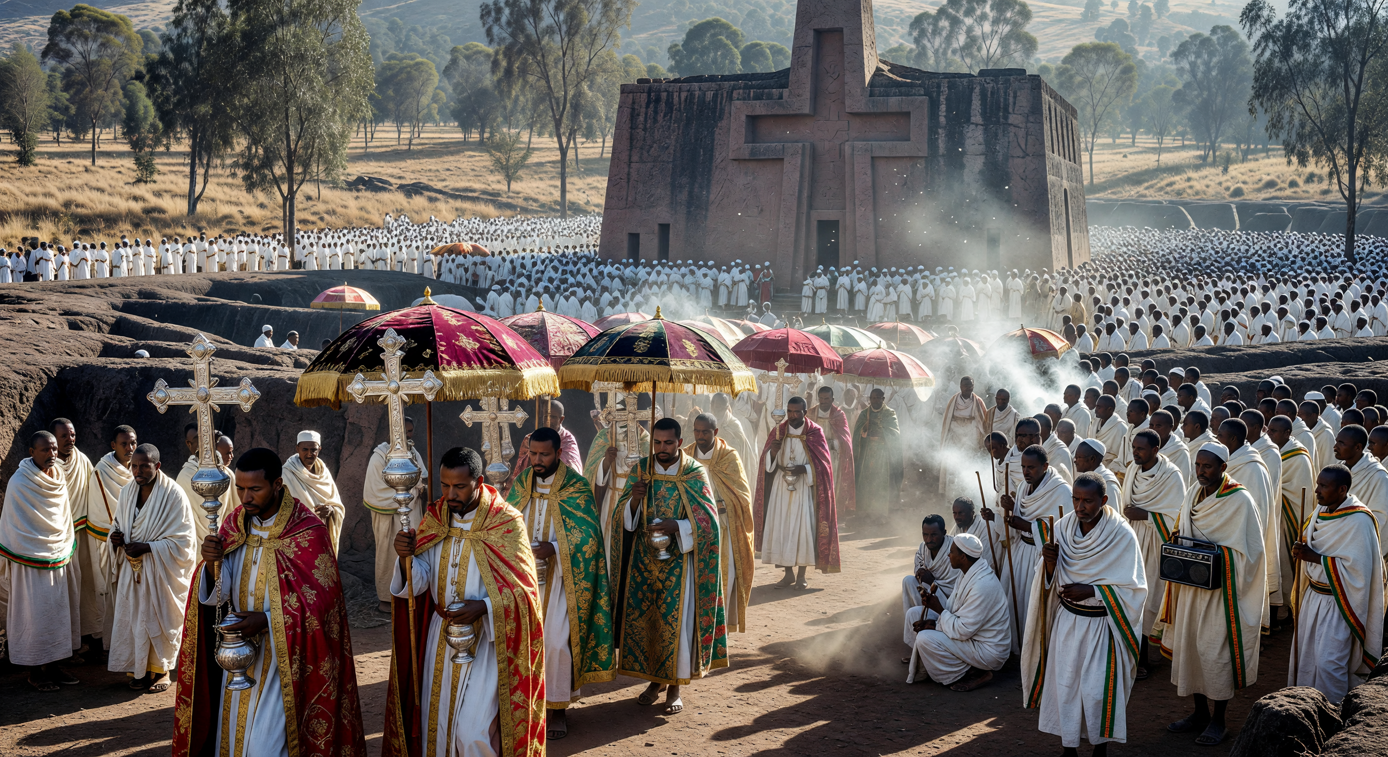 The image effectively captures many authentic elements of a Timkat (Ethiopian Epiphany) procession, including priests in vibrant embroidered vestments (red, green, gold brocade), processional crosses held aloft, fringed ceremonial umbrellas in red and gold, swinging censers emitting frankincense smoke, and crowds of pilgrims in white shamma robes gathered on dusty terrain. The Ethiopian Highlands landscape with scattered acacia-like trees, reddish earth, and arid conditions is visually coherent and plausible for Lalibela in 1975, with no glaring anachronisms like modern vehicles or clothing. Culturally, the composition evokes the solemn, fervent atmosphere of the ritual, accurately reflecting Orthodox traditions without technological outliers (no evident portable radios upon close inspection). However, the depiction of the Church of Saint George (Bete Giyorgis) is a significant inaccuracy: it appears as a freestanding, above-ground monolithic structure with a carved cross facade, rising prominently amid the crowd. In reality, this 12th-century rock-hewn church is excavated downward into a deep trench, forming a cruciform plan visible primarily from above at ground level, with steep access via tunnels—its sunken, inverted-carving nature is the defining architectural marvel. This misrepresentation undermines the historical and educational value, necessitating a full regenerate for a top-down or accurate pit-view perspective.