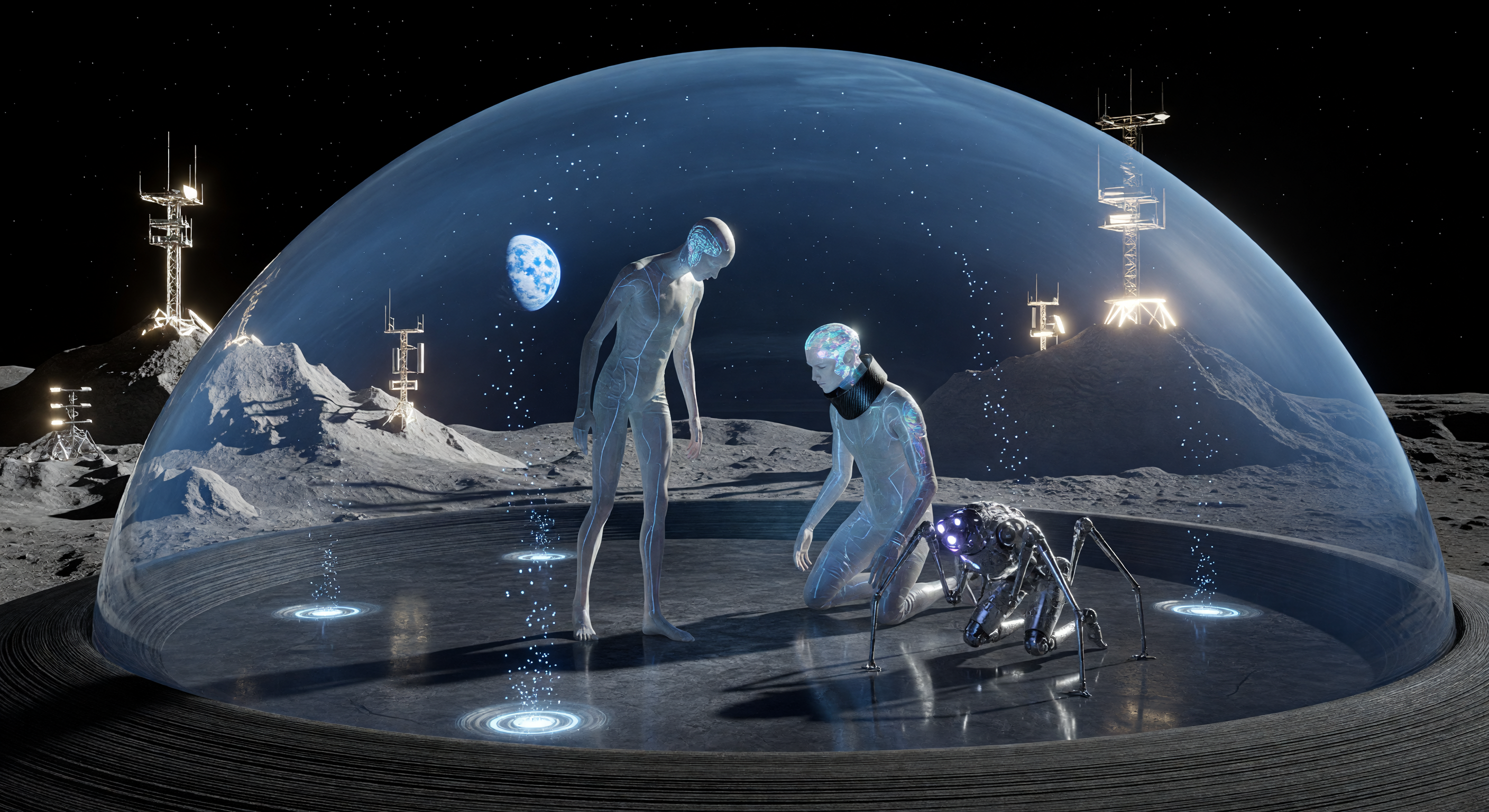 Das Bild zeigt eine visuell eindrucksvolle und weitgehend kohärente Darstellung eines nahzukünftigen Mondaußenpostens. Der Mondregolith, der tiefschwarze Himmel, die am Horizont sichtbare Erde und das Fehlen einer Atmosphäre sind wissenschaftlich angemessen. Die transparente Kuppel, Sendeanlagen auf den umliegenden Gipfeln, der polierte reflektierende Boden und der mehrbeinige Roboter tragen alle zu einer plausiblen spekulativen Szene bei. Dennoch verdienen mehrere Probleme Beachtung. Die große transparente Polymer-Kuppel ist für den Zeitraum 205–210 problematisch: Eine solche Struktur würde im Wesentlichen keinen Schutz gegen solare und kosmische Strahlung, Mikrometeoroideneinschläge oder die extremen thermischen Zyklen (~300 K Temperaturschwankung) auf der Mondoberfläche bieten. Ein realistischeres Habitat würde eine starke Regolithabschirmung aufweisen, möglicherweise mit kleinen, stark verstärkten Sichtfenstern. Die menschlichen Figuren sind extrem stilisiert — nahezu fremdartig im Erscheinungsbild, mit durchscheinender Haut, auf der schaltkreisartige Muster sichtbar sind, und glatten, haarlosen Formen. Das wirkt weit eher wie transhumanistische Konzeptkunst als wie eine fundierte Projektion der nahen Zukunft. Auch die extreme Streckung der stehenden Figur ist für nur 1–2 Generationen des Lebens in geringer Gravitation übertrieben; obwohl Mikrogravitation messbare skelettale Veränderungen verursacht, strapaziert die Entstehung eines sichtbar eigenständigen Morphotyps innerhalb von 50 Jahren die Glaubwürdigkeit. Der Roboter wirkt zwar interessant, erscheint jedoch eher als sechsbeinige, arthropodenartige Form als als etwas offensichtlich „vielgliedriges“ in einer Weise, die zur „Hollowed“-Beschreibung in der Bildunterschrift passt. Die leuchtenden Bodenelemente sind ästhetisch ansprechend, bleiben aber unerklärt.
