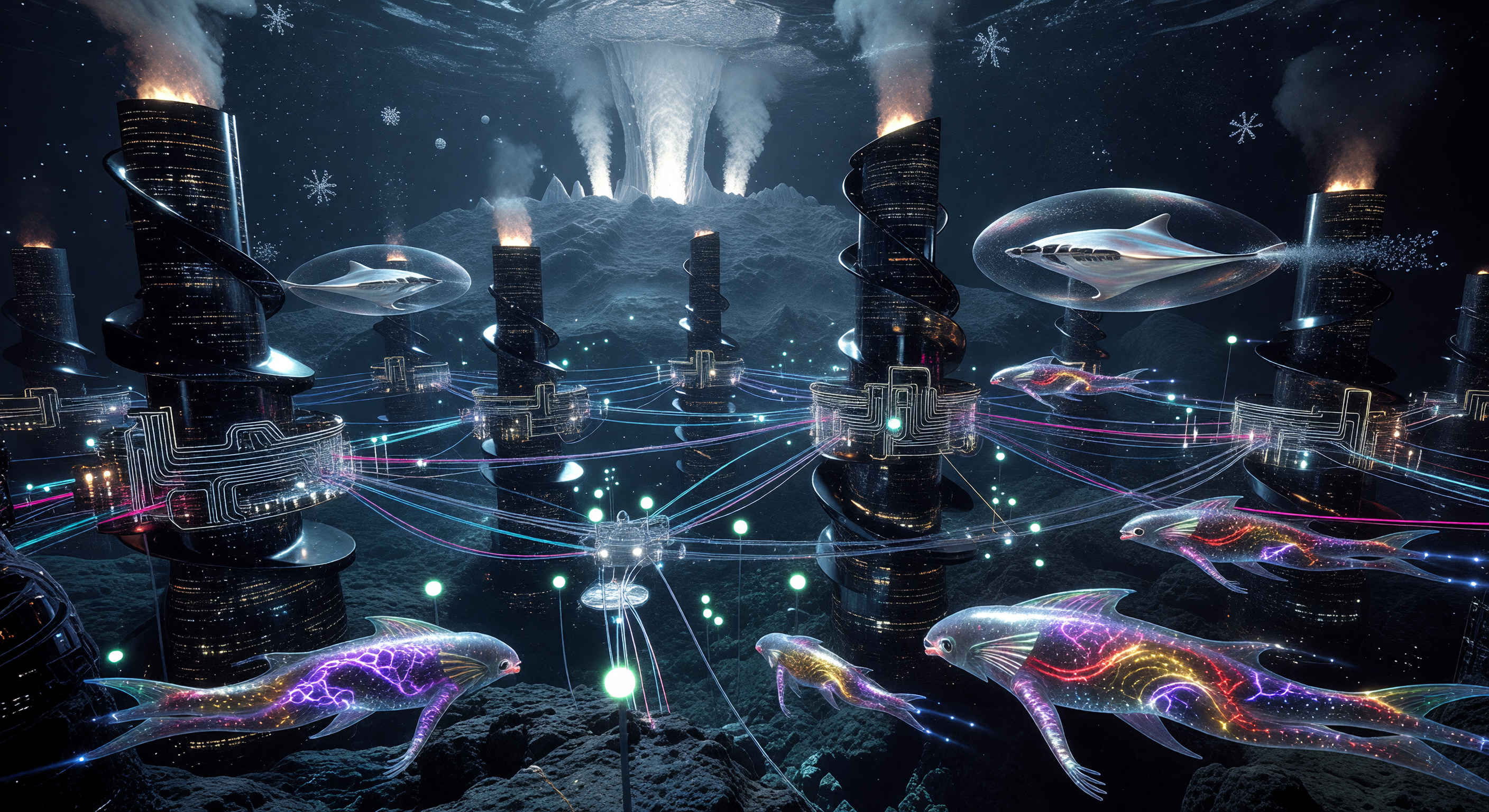 In den lichtlosen Tiefen des Exoplaneten K2-18b ragen monumentale Spiralstädte aus Obsidian empor, die während des Galaktischen Zeitalters (ca. 5.000–20.000 n. Chr.) das Zentrum einer technologisch fortgeschrittenen marinen Zivilisation bildeten. Man erkennt die postbiologischen „Pelluciden“, deren transparente Körper von supraleitenden neuronalen Netzen durchzogen sind, wie sie zwischen leuchtenden Datenfilamenten und massiven, manta-ähnlichen Frachtdrohnen navigieren. Diese hochkomplexe Gesellschaft nutzt hydrothermale Energie und mikrofluidische Computersysteme, um ein kollektives Bewusstsein aufrechtzuerhalten, das weit über die Grenzen herkömmlicher organischer Biologie hinausreicht.
