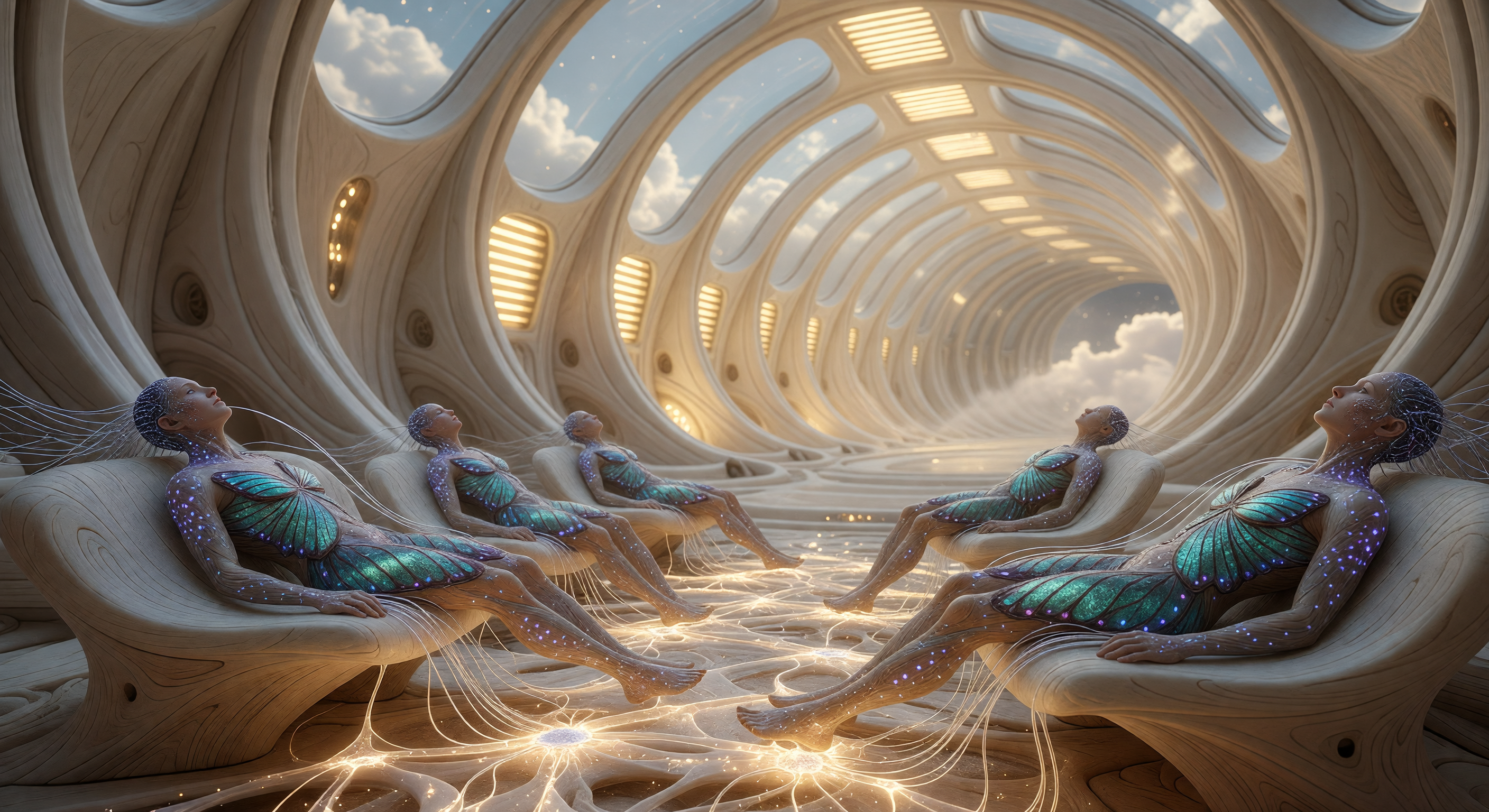 The image is visually compelling and broadly consistent with the Horizon/Seeder concept. The organic tunnel architecture with layered, ribbed, wood-grain-textured walls does evoke a bio-engineered 'World-Tree' interior plausibly. The reclining figures display iridescent teal/blue patterning (particularly the butterfly-wing-like chest structures) and appear connected by luminous white filament tendrils that converge on glowing nodes in the floor—a reasonable visual analog for the 'Synesthetic Communion' described. The bioluminescent dots scattered across the figures' bodies are a nice touch reinforcing the neural signaling concept. However, the background opens into what appears to be a sky with clouds and daylight, which is visually confusing for an interior space station 100 km long and presumably in deep space. This is the most significant image inconsistency—it undercuts the 'station' setting and implies either a planetary environment or a poorly conceived visual.