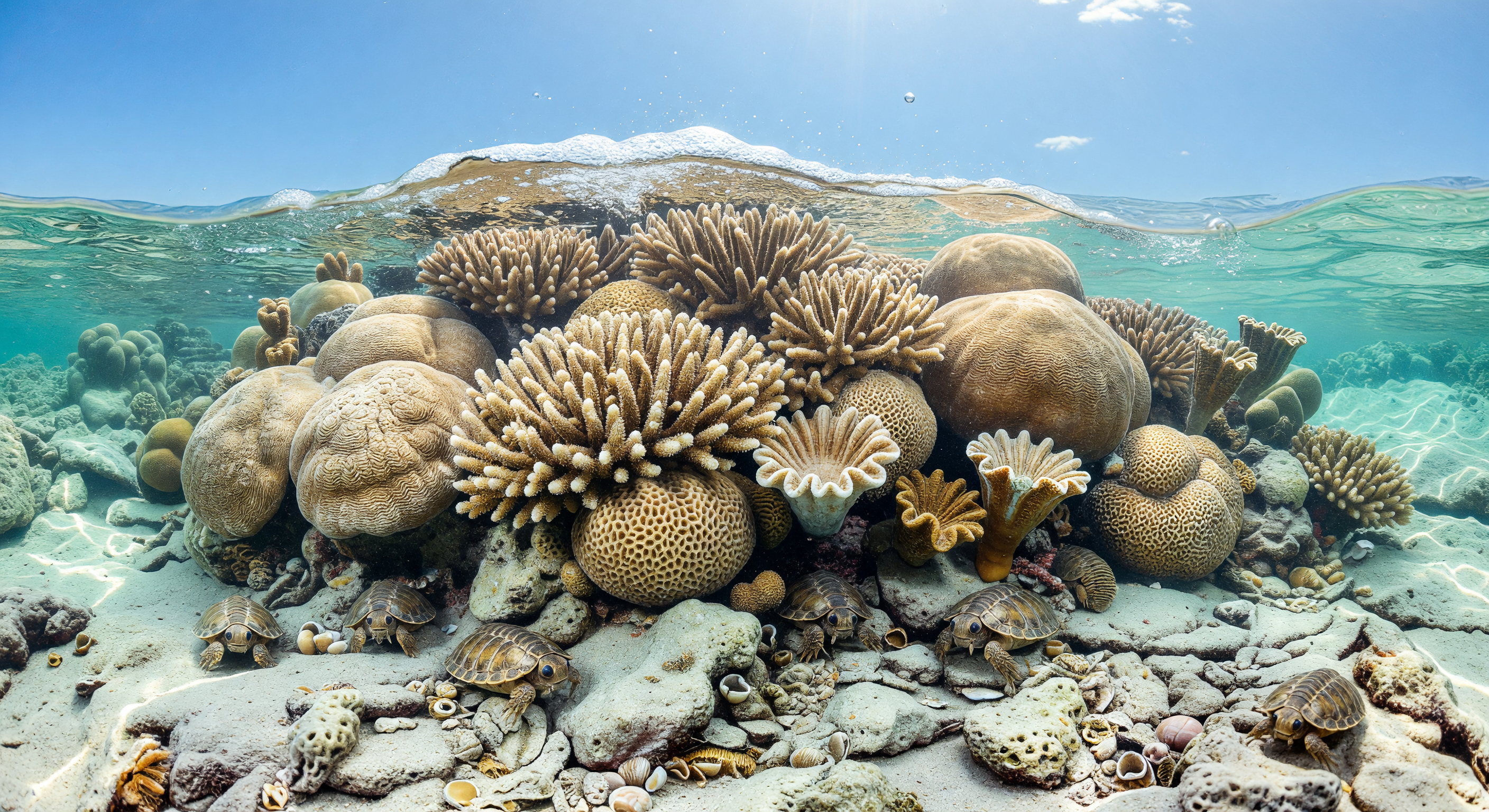 IMAGE issues identified by the committee: 1) The foreground crawling animals are unambiguously modern sea turtles/chelonians, with domed carapaces, flipper-like limbs, and turtle-like heads; these are a major anachronism because turtles did not exist in the Devonian. 2) The reef-builders resemble modern scleractinian corals, especially Acropora-like branching forms and massive Porites/brain-coral-like domes, rather than Devonian stromatoporoids, tabulate corals, or rugose corals. 3) The overall scene has the look of a modern Indo-Pacific coral reef rather than a Devonian reef framework. 4) The massive domed forms are visually too smooth/bulbous and modern-looking; they do not clearly show stromatoporoid surface texture such as laminated, mammillate, or otherwise diagnostic stromatoporoid structure. 5) The image includes a large central fluted object that reads as a modern giant clam (Tridacna)-like form, another post-Devonian/Mesozoic-looking element. 6) The crawling fauna do not clearly match trilobites; they are turtle-like, and even the intended Phacops identity is not visually supported. 7) The reef architecture feels like a generic layered coral reef rather than a specific stromatoporoid–coral reef crest with the lower-relief Devonian character.