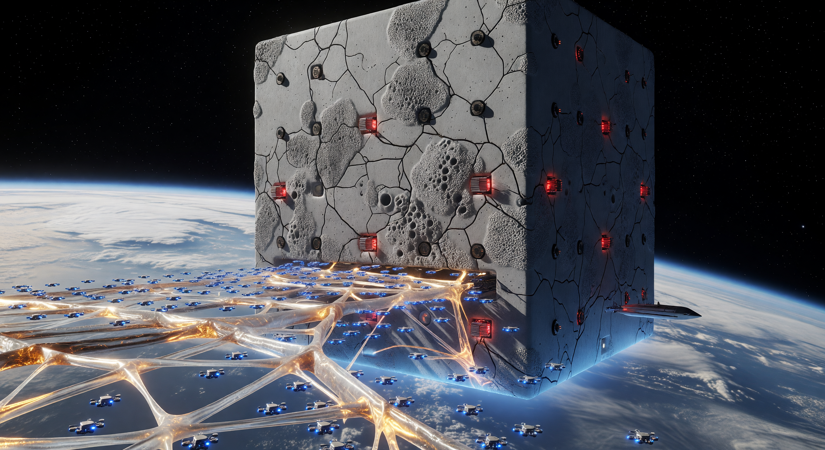 The committee agrees that the scene strongly and coherently reads as a speculative Low Earth Orbit industrial construction site: the Earth limb, starfield, harsh solar lighting, cool Earthshine, massive windowless orbital monolith, and the surrounding swarm of small blue-lit drones all support the Great Divergence / Architecture & Urbanism setting. The porous, cracked hull texture also plausibly suggests a biocrete-like surface, and the glowing filament network does convey an exospheric docking/construction environment.