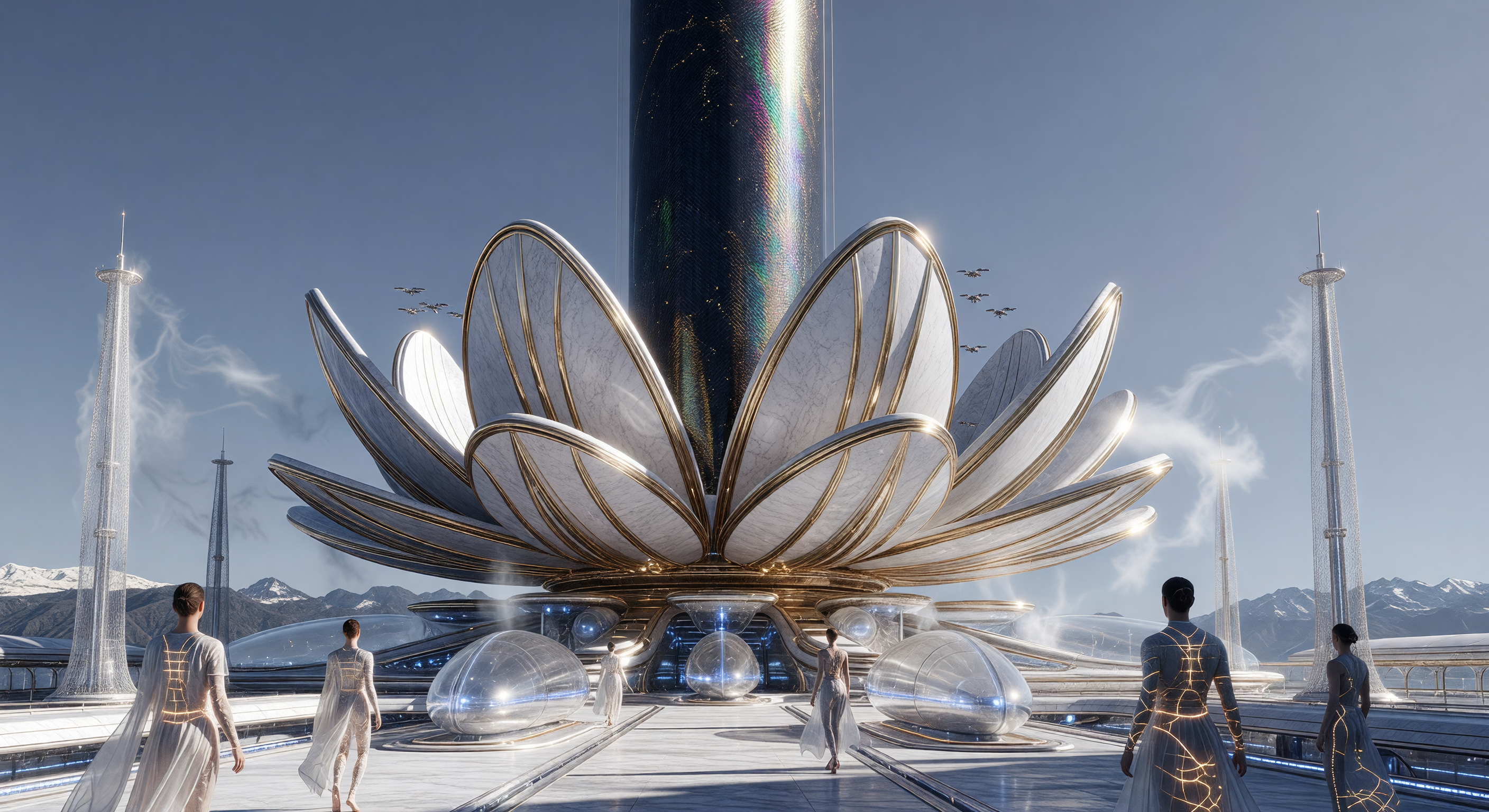 The image excellently captures a speculative futuristic architecture in a high-altitude Andean setting, with snow-capped peaks in the background aligning with Quito's geography. The central structure is a massive, iridescent black pillar rising prominently, surrounded by a five-kilometer-scale lotus-like floral base of white/gold petal structures, observation decks, and metallic towers—visually coherent and plausible for 220–250 CE tech. Human figures on the decks show elongated, slender forms with glowing bioluminescent tracery on their skin and clothing, matching bio-integrated humans. Small aircraft and orbital structures in the distance enhance the space-tech theme without anachronisms. No cultural inaccuracies for a divergent future Ecuador; scientifically, the high-altitude clarity and mountain geology are spot-on. Minor nit: the 'ribbon' tether reads more as a thick column than a thin cable, but it's visually striking and approve-worthy overall.
