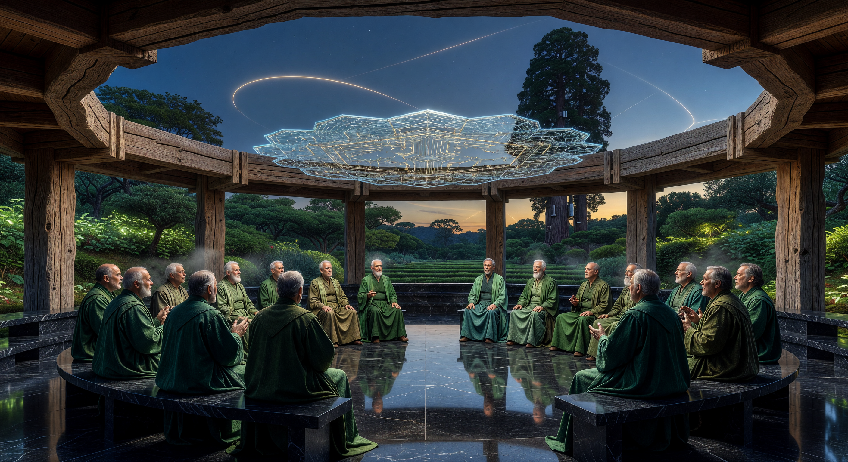 The image effectively captures a visually coherent scene of deliberation in a nature reserve pavilion, with cross-laminated timber architecture, polished black basalt flooring, lush terraced gardens, and a centrally suspended translucent lattice that convincingly represents a futuristic microwave rectenna array powered by a Dyson Swarm (subtle orbital streaks in the twilight sky enhance this). The East Asian-inspired garden (clipped hedges, terracing, coniferous trees) and participants in traditional green hanfu-style robes evoke a plausible cultural continuity for a 245 CE 'Cradle of Stasis' reserve committed to stasis and heritage preservation. However, the all-elderly, apparently East Asian male homogeneity undermines the 'Ecoregional Synod' as a global body, lacking diversity expected in a planetary treaty assembly. No overt anachronisms or scientific implausibilities; the tech integrates elegantly without clashing with the pre-industrial aesthetic. Minor prompt refinements for demographic diversity and subtle regional/landscape cues aligning with a specific Earth nature reserve would suffice—no regenerate needed.