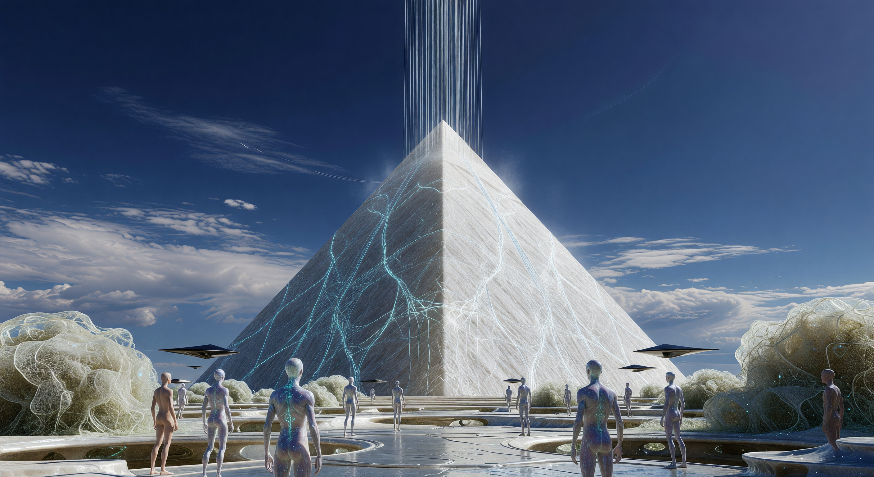 **Bildprobleme:** 1. Die Umgebung weist keine kenianischen oder ostafrikanischen Merkmale auf (z. B. tropische Vegetation oder geografische Marker). 2. Die posthumanen Figuren sind durchweg blass/translucent und zeigen keine kulturelle Repräsentation. 3. Der visuelle Schmutz durch fliegende Fahrzeuge trägt nicht klar zur Erzählung bei. 4. Die Pyramide wird mit einem einzigen leuchtenden Schacht für den Weltraumaufzug dargestellt, anstatt mit mehreren Kabeln, was nicht mit der Beschreibung der Bildunterschrift übereinstimmt.