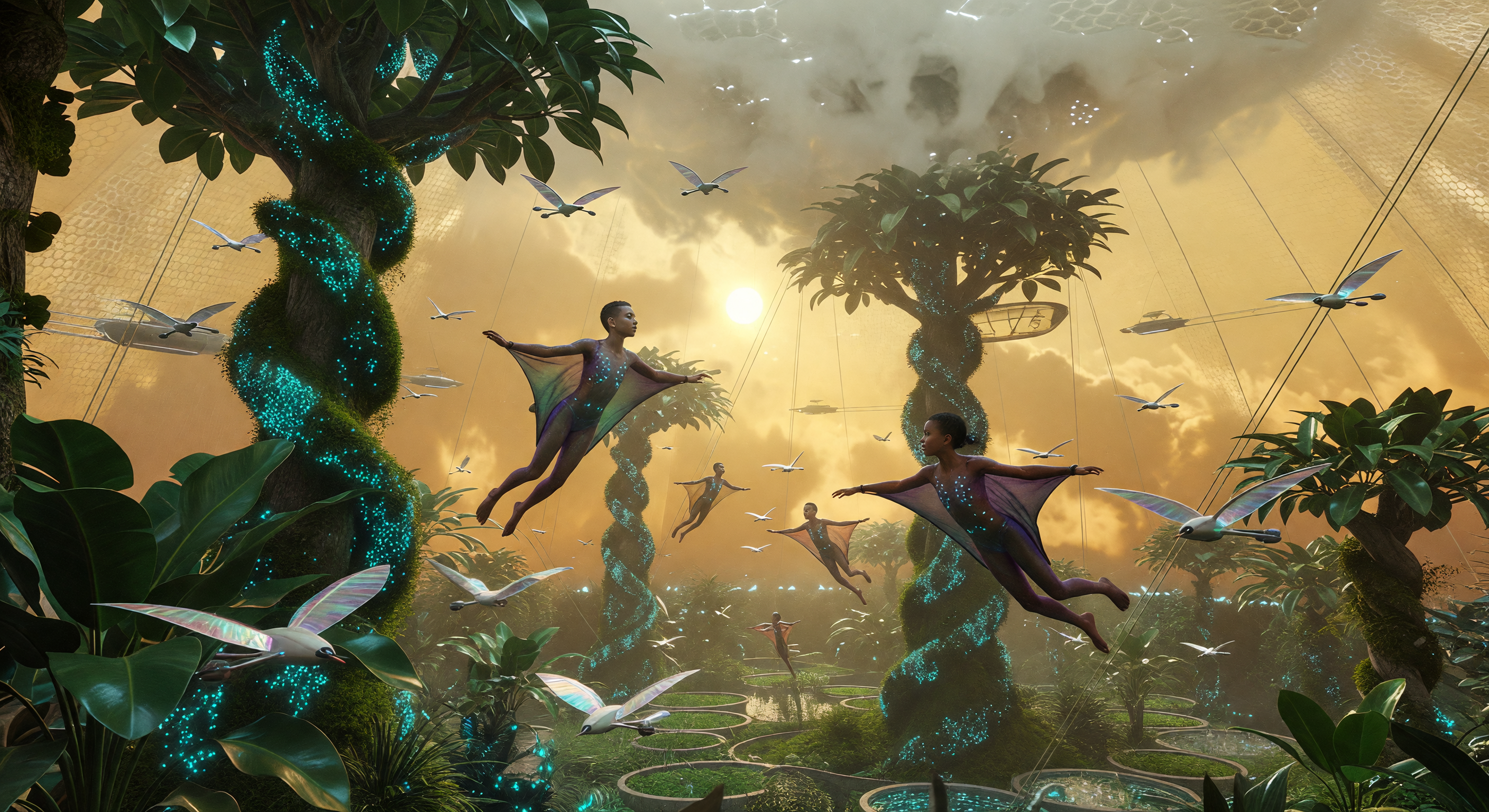 In der Ära der Konvergenz (2100–2200) ermöglichten die Ishtar-Wolkenstädte eine dauerhafte Besiedlung der Venus, 52 Kilometer über der lebensfeindlichen Oberfläche. In diesem vertikalen Dschungel-Sanctuary navigieren Aeros-Menschen – deren Physiologie durch UV-resistente Polymere und Lungen-Symbionten transformiert wurde – mittels Gleitmembranen durch die Aufwinde bio-manipulierter *Ficus*-Wälder. Begleitet werden sie von Syntho-avian-Schwärmen, biomimetischen KI-Einheiten mit schimmernden Photovoltaik-Flügeln, die in der goldfarbenen Schwefelatmosphäre als lebendes sensorisches Netzwerk agieren. Diese Szene illustriert ein hochspezialisiertes Ökosystem, in dem die Grenzen zwischen biologischer Evolution und synthetischer Ingenieurskunst im Dienste der planetaren Erschließung verschwimmen.