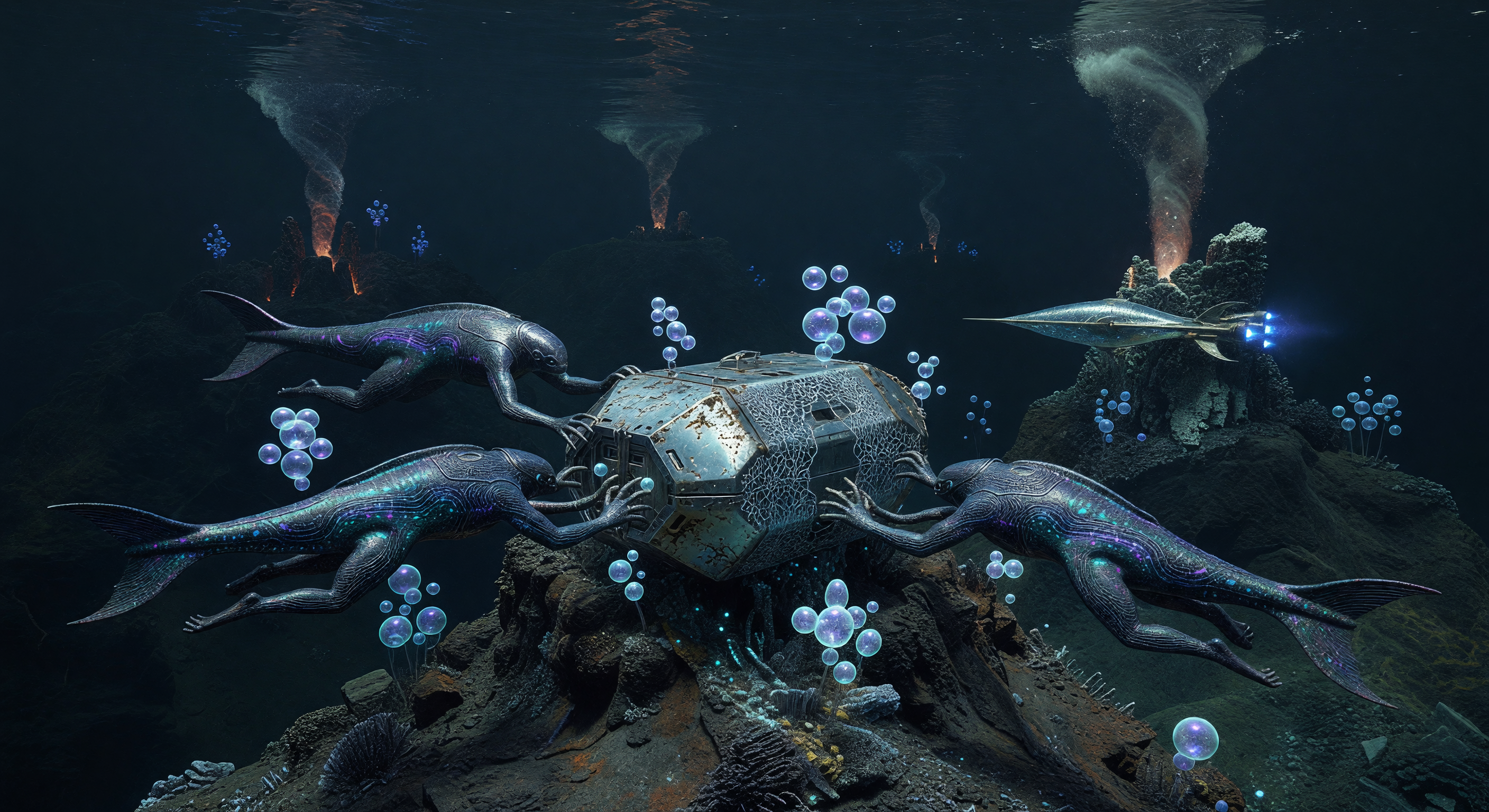 The image effectively captures a speculative, scientifically plausible underwater scene on an ocean world like Tau Ceti e. It depicts five streamlined, bioluminescent cetacean-humanoid creatures (Cetus-Sapiens) with multi-fingered tendrils actively interacting with a central, barnacle-encrusted metallic module resembling a submerged landing craft or casket, anchored on a rocky seafloor amid hydrothermal vents emitting plumes and clusters of iridescent, floating bubbles (plausibly microbial or chemical byproducts in a deep-sea environment). The morphology of the beings—elongated bodies, fishtails, reinforced-looking iridescent skin, and precise tendril manipulation—aligns well with bio-engineered post-humans adapted for high-pressure depths, showing no anachronisms and strong visual coherence. Geology features rugged ridges and vents consistent with a tectonically active ocean world, evoking a 'Himalayan Ridge' analogue without Earth-specific inaccuracies. No cultural or astronomical issues; the tech (weathered module with subtle lights) fits 291 AD interstellar era artifacts in a 300-500 AD context. Minor nit: five creatures instead of three, but this enhances the ritual 'merging' dynamism without detracting from plausibility.