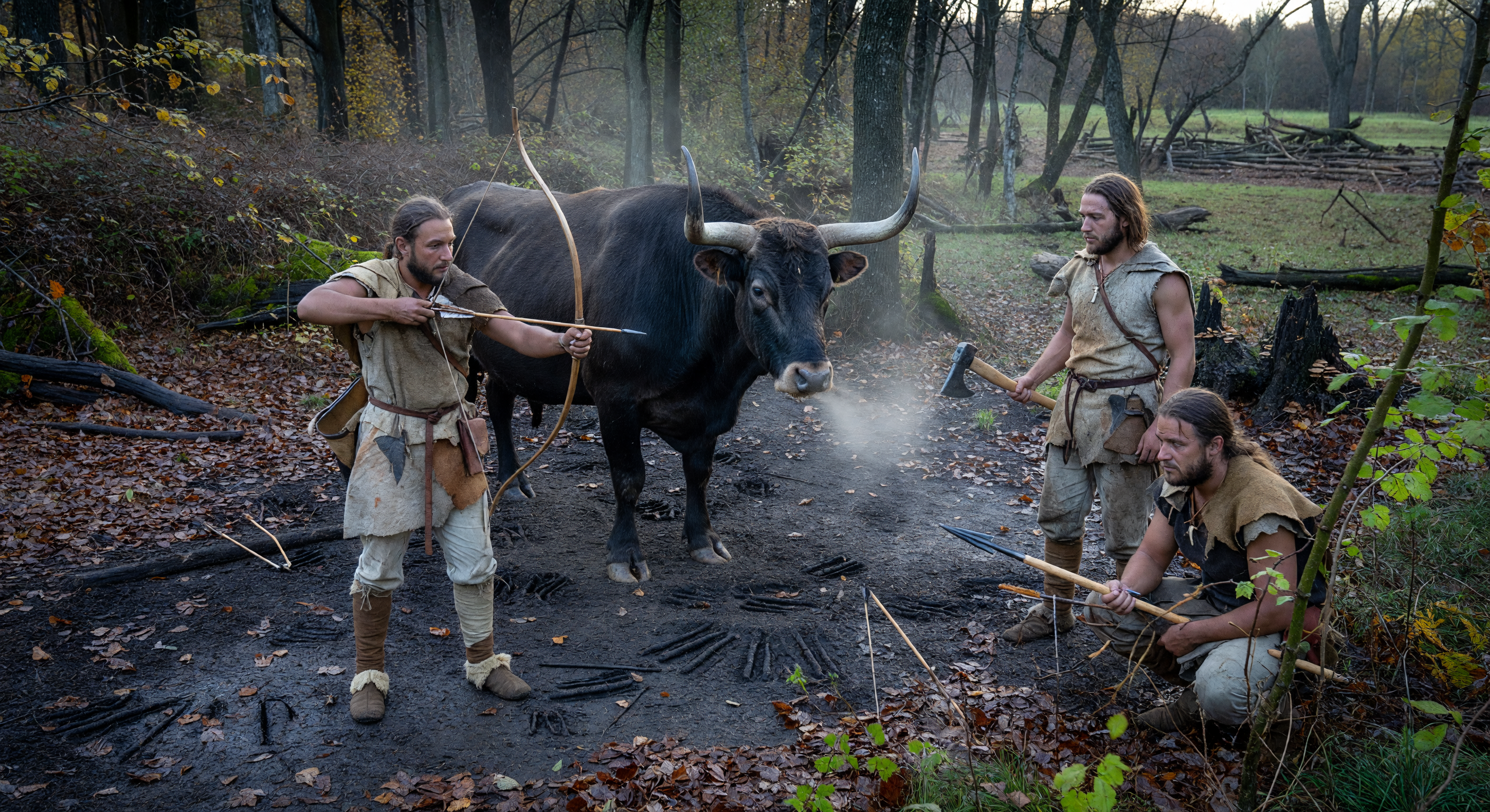 In einer feuchten Waldlichtung des neolithischen Europas stehen Jäger mit einfachen Selbstbögen, Feuersteinpfeilen und geschliffenen Steinbeilen einem mächtigen Auerochsenbullen gegenüber, dessen dunkles Fell, heller Maulring und weit nach vorn geschwungene Hörner ihn eindrucksvoll aus dem Laub und Dunst hervortreten lassen. Die Szene zeigt eine Zeit, in der Ackerbau und Rodungen zwar bereits Teile der Landschaft veränderten, große Mischwälder jedoch noch weite Teile Europas bedeckten und wilde Großtiere wie der Auerochse weiterhin eine reale Gefahr und begehrte Beute waren. Kleidung aus Fell, Bastfasern und schlichtem Gewebe sowie vollständig metallfreie Waffen entsprechen dem archäologischen Bild vieler neolithischer Gemeinschaften in Mittel- und Westeuropa.