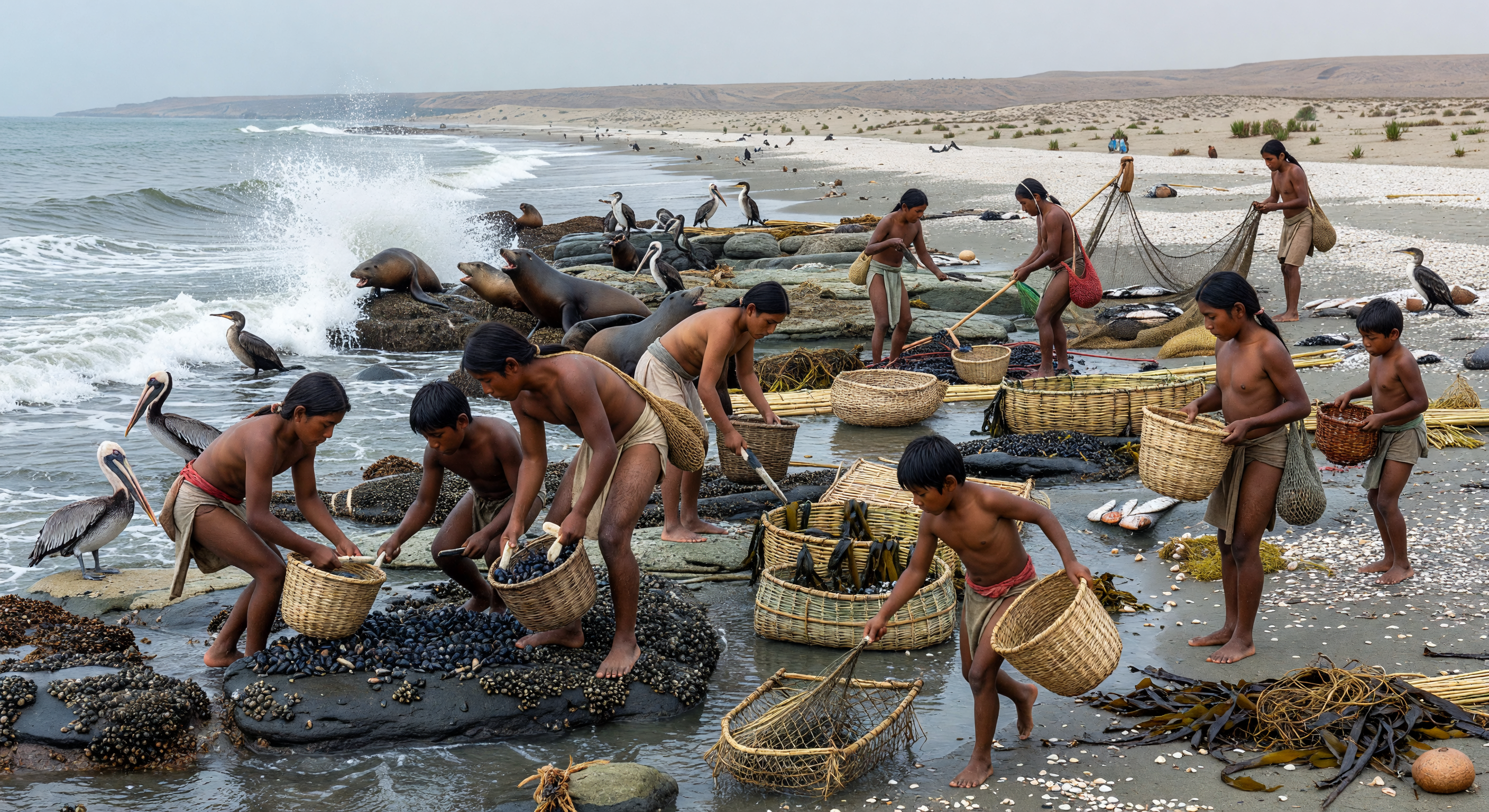 An der felsigen Pazifikküste des heutigen Peru sammeln Familien im späten 4. Jahrtausend v. Chr. Muscheln und Napfschnecken von nassen schwarzen Felsen, während Kinder geflochtene Körbe an Schilf-Fischfallen vorbei über den glitschigen Strand tragen und Seelöwen, Pelikane und Kormorane die Brandung beleben. Die Szene zeigt eine frühe präkeramische Küstengemeinschaft der Zentralanden, deren Leben stark auf dem reichen Humboldtstrom beruhte: Noch ohne Keramik oder Monumentalbauten nutzten diese Menschen Schilf, Baumwollnetze, Stein- und Knochenwerkzeuge sowie Sammelplätze aus Muschelabfällen, um die Ressourcen des Meeres intensiv zu erschließen.