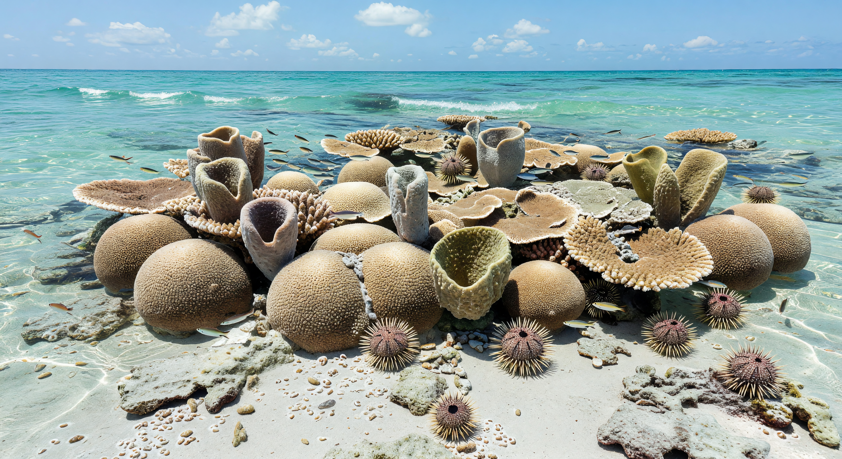 The committee agrees the scene is broadly accurate for a Late Jurassic tropical Tethyan shallow-marine carbonate reef: the turquoise clear water, reef-crest setting, mound/plate/vase-like framework, small fish, and overall warm-seas ecology are all consistent with the period. The caption’s basic time/place framing and the use of representative Jurassic taxa are also generally supported. However, the image contains a significant morphological issue with the sea urchins, and the caption makes several taxonomic identifications more specific than the image can clearly support.